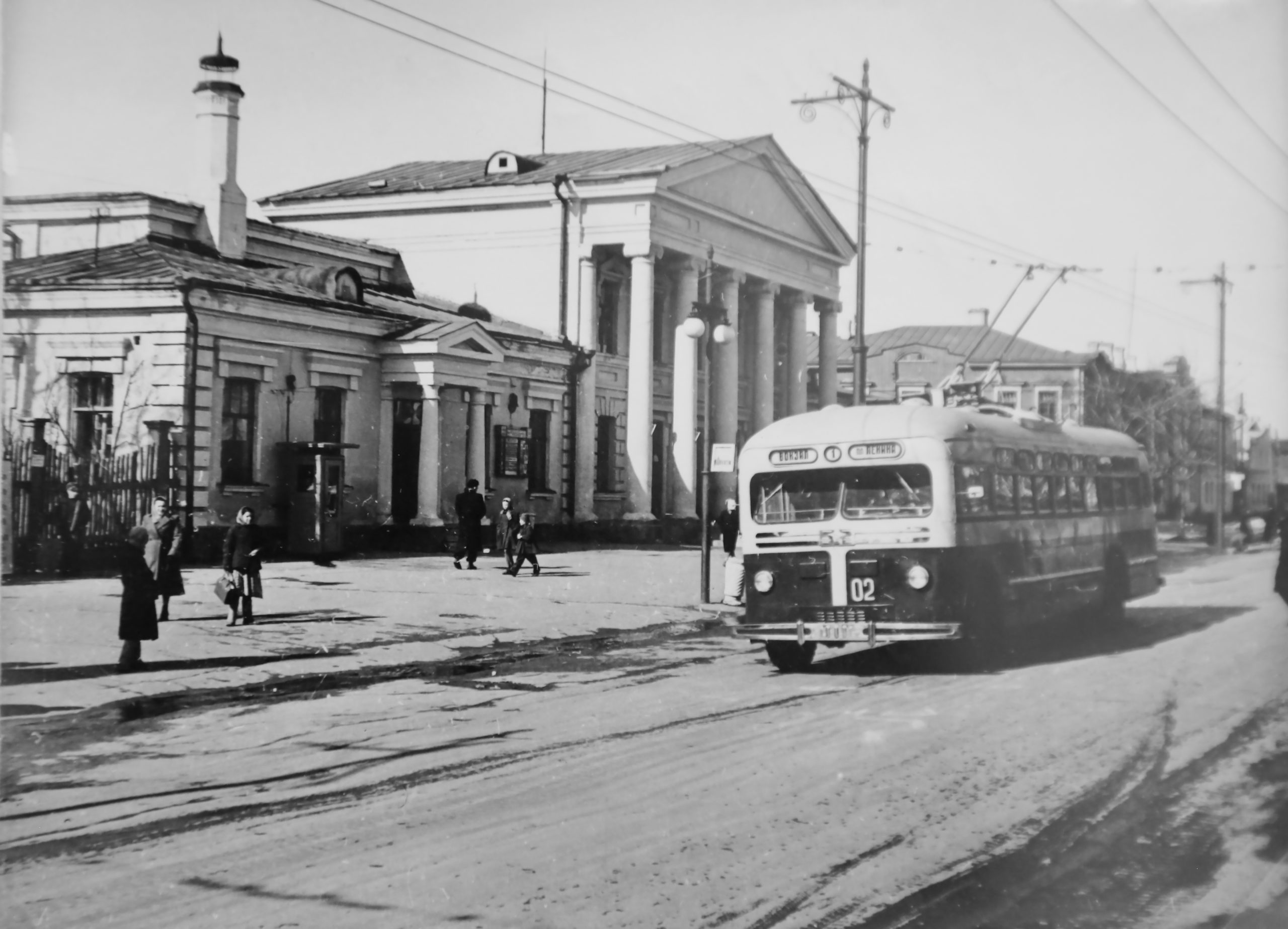 Остановки маршрута № 1: «Вокзал», «Винзавод», «Привокзальный рынок», «Мелькомбинат», «Облдрамтеатр», «Кинотеатр «Центральный», «Сквер имени Ленина». На фото – остановка «Облдрамтеатр». Театр занимал помещение клуба имени Андреева до конца 1958 года.