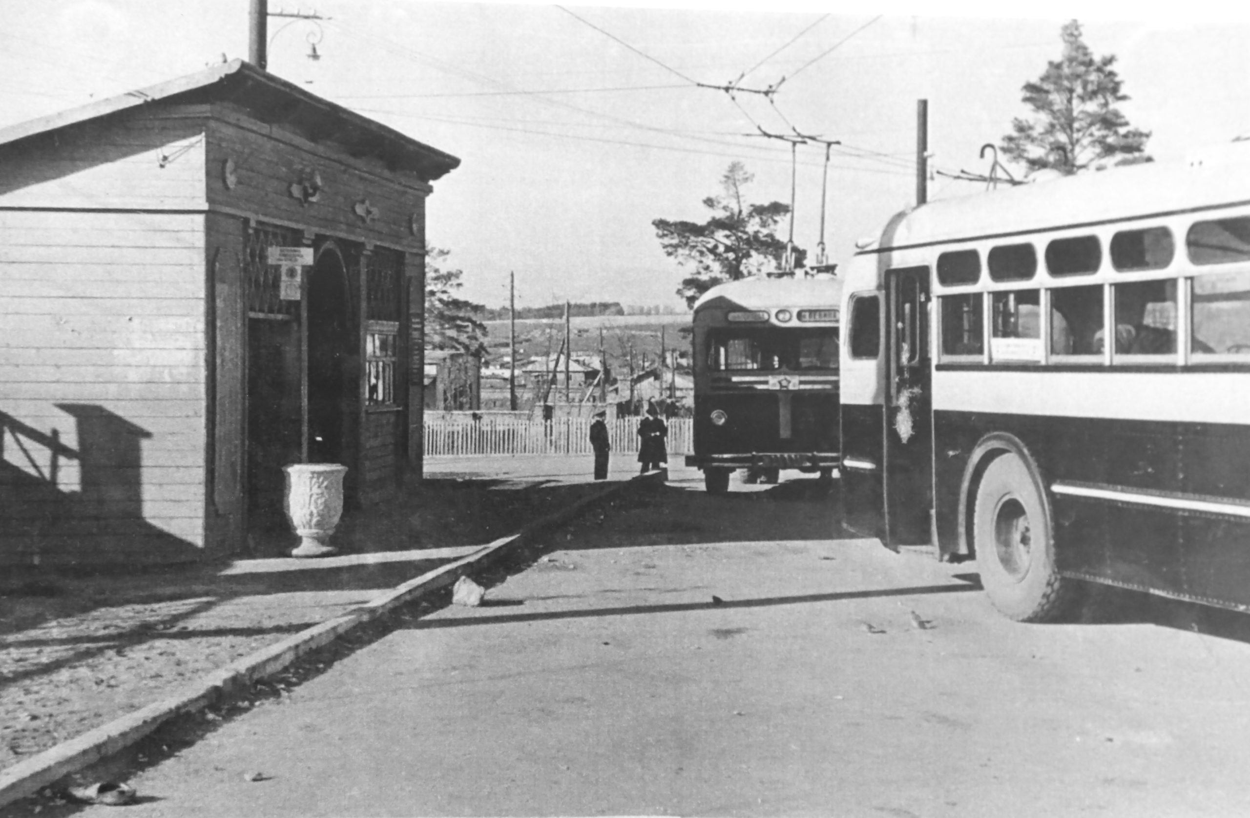 Остановочный павильон на конечной маршрута № 2. С мая 1956 года маршрут именовался «Комбинат СДВ – площадь Ленина», а с февраля 1957-го движение троллейбусов по нему продлили до посёлка Середа.