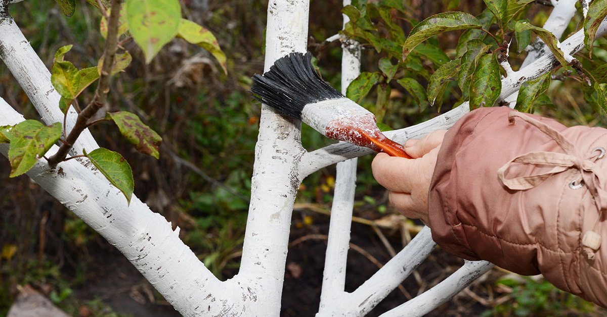 Одна из обязательных осенних работ – побелка деревьев. Насколько высоко нужно белить? Как сможете дотянуться. Проблема в том, что поздней осенью редко бывает сухая погода несколько дней подряд. Альтернатива краске – нарезанный лентами белый спанбонд или лутрасил, которым можно обмотать стволы и скелетные ветви. Как только весной ночью установится плюсовая температура, «бинты» обязательно нужно снять и сохранить до будущей осени – они многоразовые.