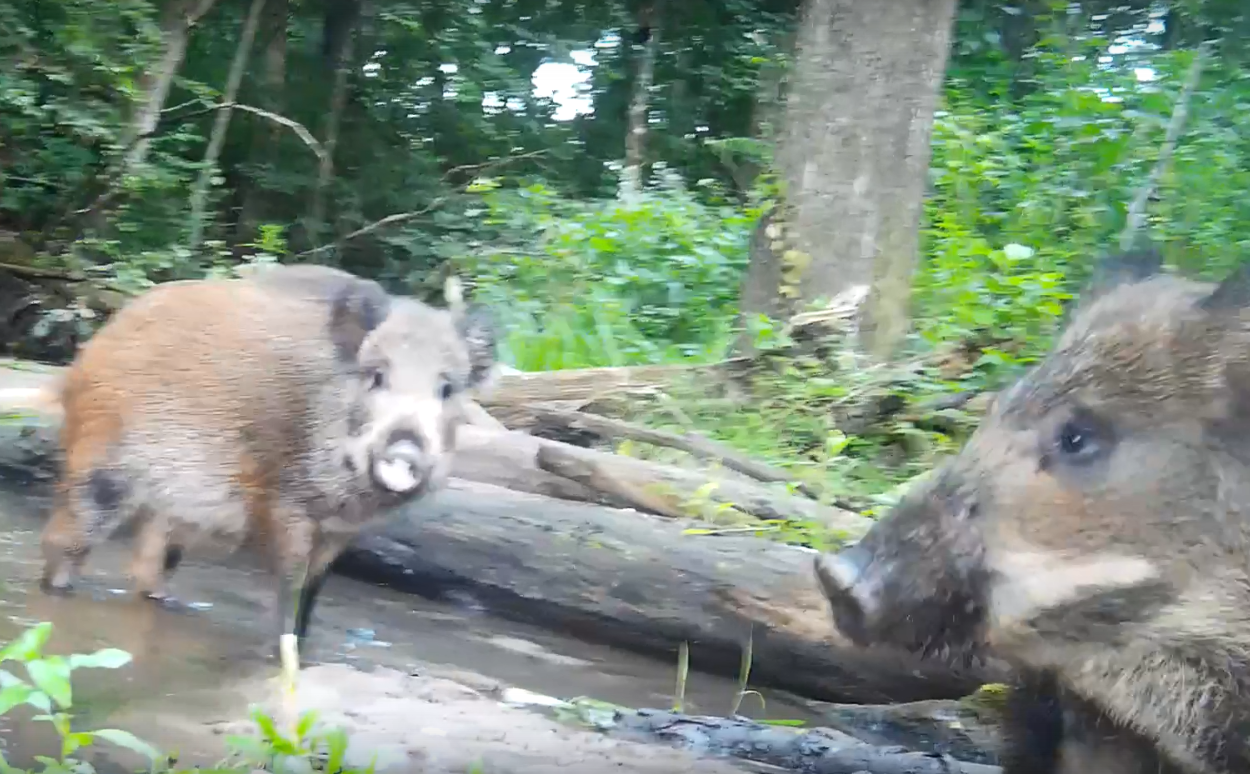 Заповедник «Калужские засеки» поделился видеозаписью, которую сделал глава кабаньего семейства на водопое. Увидев фотоловушку, он развернул ее пятачком, благодаря чему в кадр попало все его семейство.
