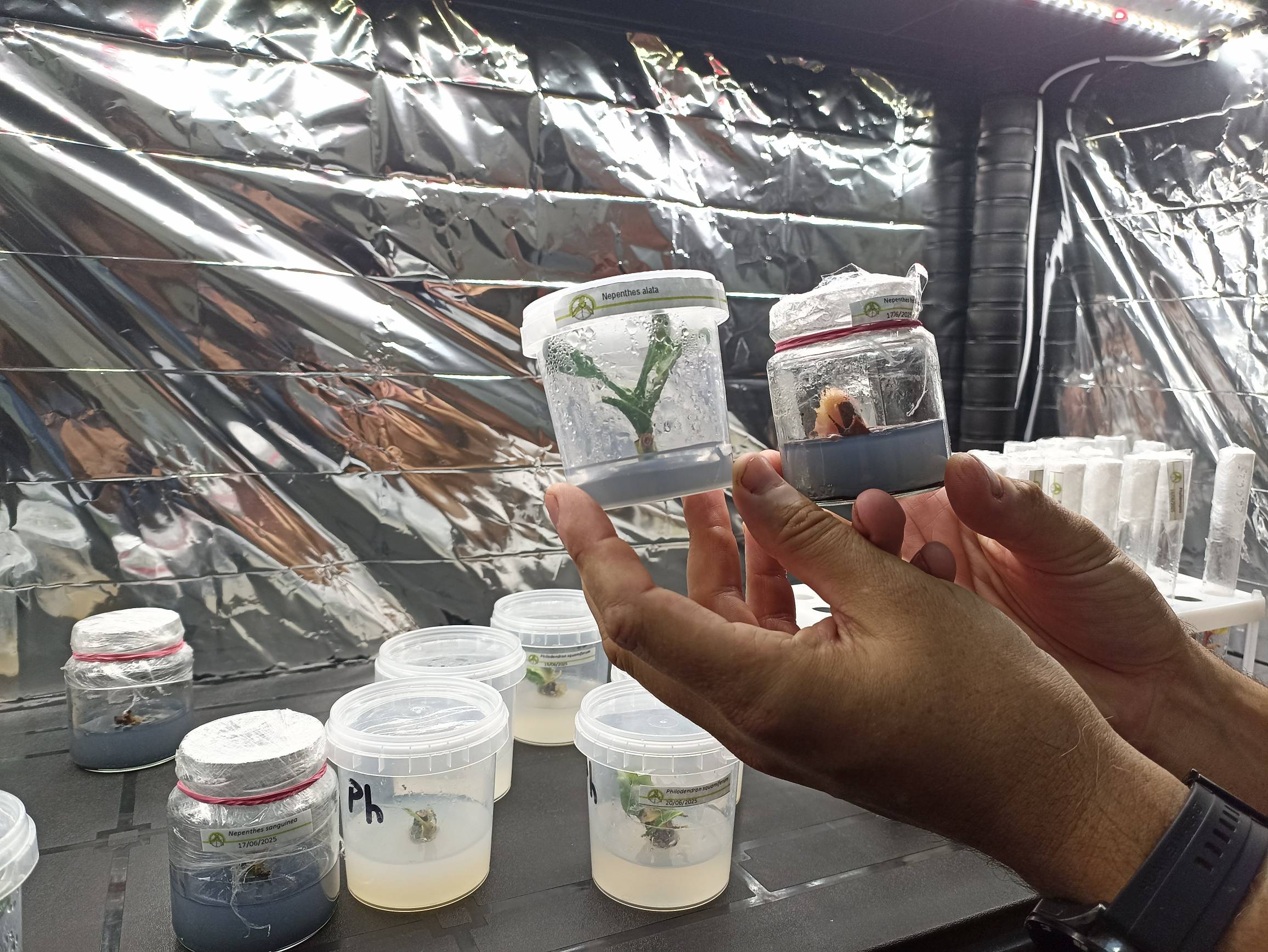 Е. К.: – На следующем этапе главная сложность – адаптировать растение, выращенное в искусственных условиях, к естественной среде обитания. Сначала его высаживают в стерильный грунт и поливают дистиллированной водой, притеняют. Чтобы на первых порах защитить растение от условно патогенных микроорганизмов, применяют биопрепараты. Постепенно происходит заселение грунта естественной микрофлорой. Технический процесс уже хорошо известен и отработан, оборудование и компоненты доступны, поэтому микроклонированием растений занимаются не только серьезные научные лаборатории, но и энтузиасты-любители. Некоторые из них делятся своими наработками в блогах, и кое-что мы у них подсмотрели. Например, используем для отделения экспланта от материнского растения не скальпель, а когтерезку для кошек и собак – это очень удобно для работы с полуодревесневшими побегами непентеса и цветоносами фаленопсиса. Бесконтактный термометр, оставшийся со времен пандемии, помогает оценить температуру стерильной среды. У коллег из промышленной лаборатории мы переняли опыт стерилизации эксплантов при помощи «Доместоса». Оказалось также, что клоны быстрее растут в среде с добавлением обычного активированного угля, который адсорбирует продукты распада. Технология микроклонирования растений в наши дни получила широкое распространение: от 50 до 70 % декоративных и плодовых растений, которые выращивают в промышленных питомниках, получены при помощи этого метода.