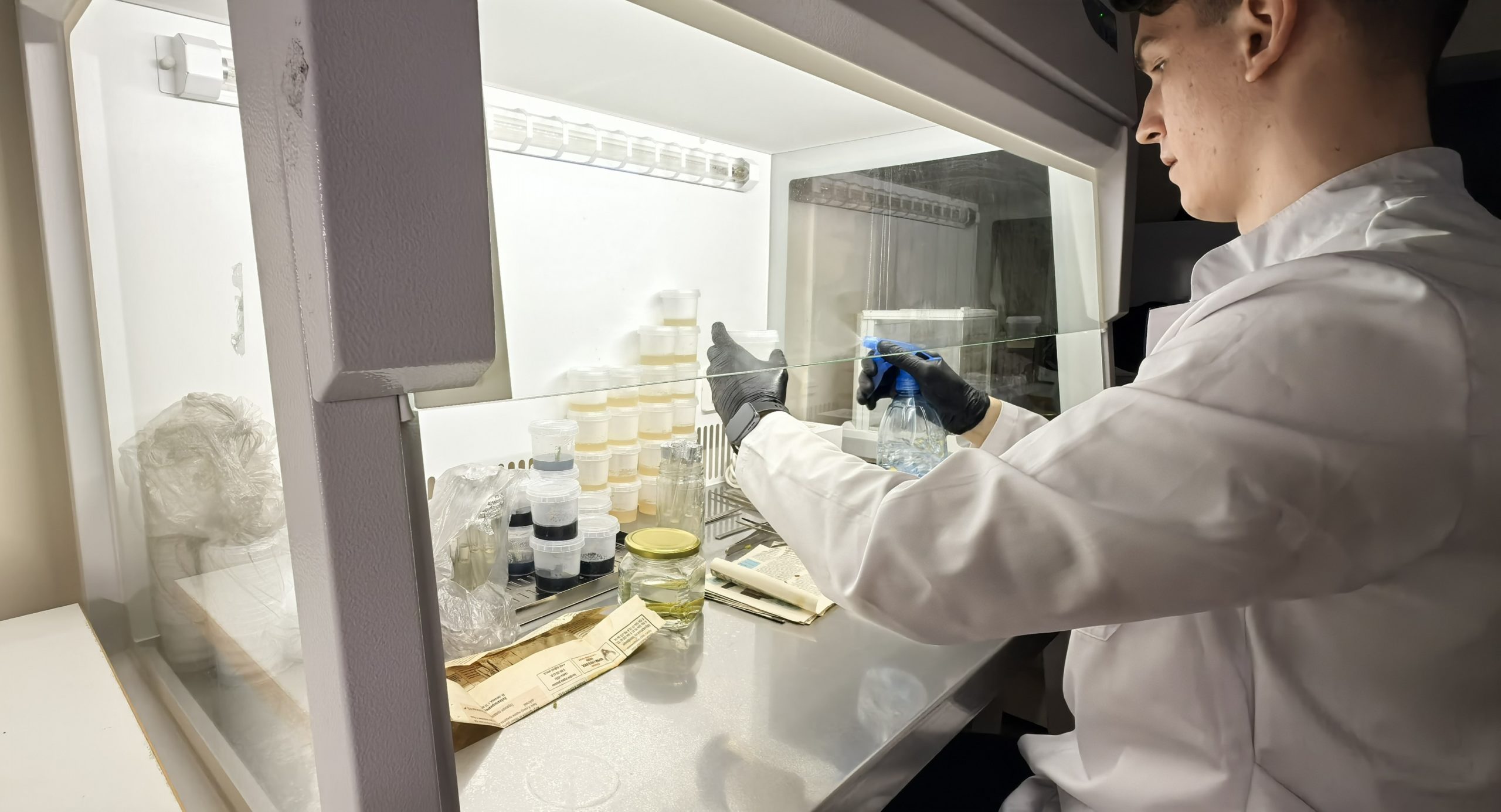 Все манипуляции проводятся в специальном прозрачном шкафу – ламинаре, в потоке стерильного воздуха. В процессе работы даже дышать приходится за стеклом шкафа. Однажды я нечаянно кашлянул, и на питательной среде выросли кокки! Обычно после работы в ламинаре вся лаборатория засыпана мелким мусором – его просто бросаешь в поток воздуха. Выращенные клоны могут стать маточниками для получения большого количества новых экземпляров этого вида.