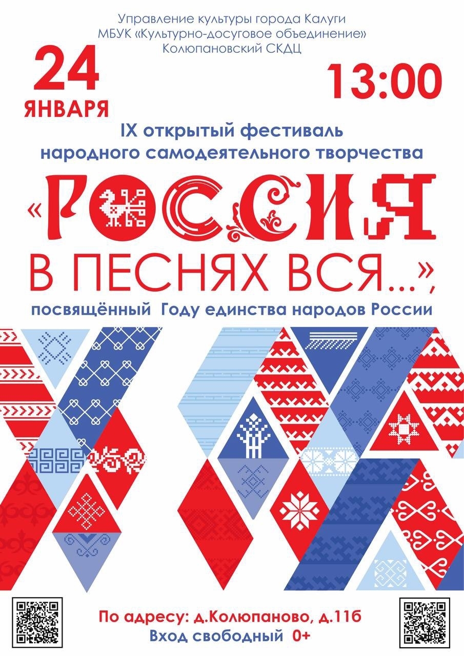 Гостей ждёт путешествие в мир живой народной музыки и душевного пения. И яркие выступления самодеятельных коллективов Калуги и Калужской области.