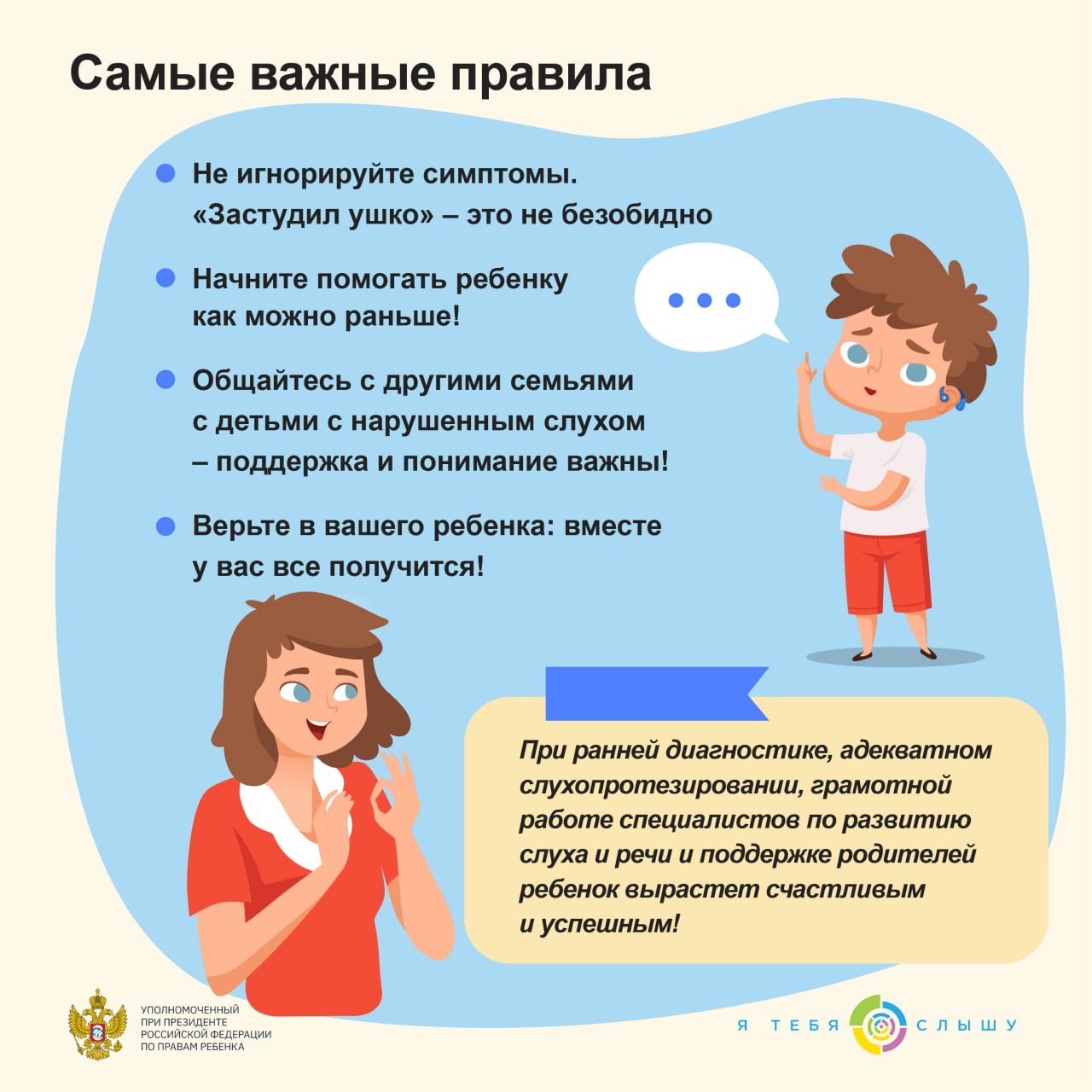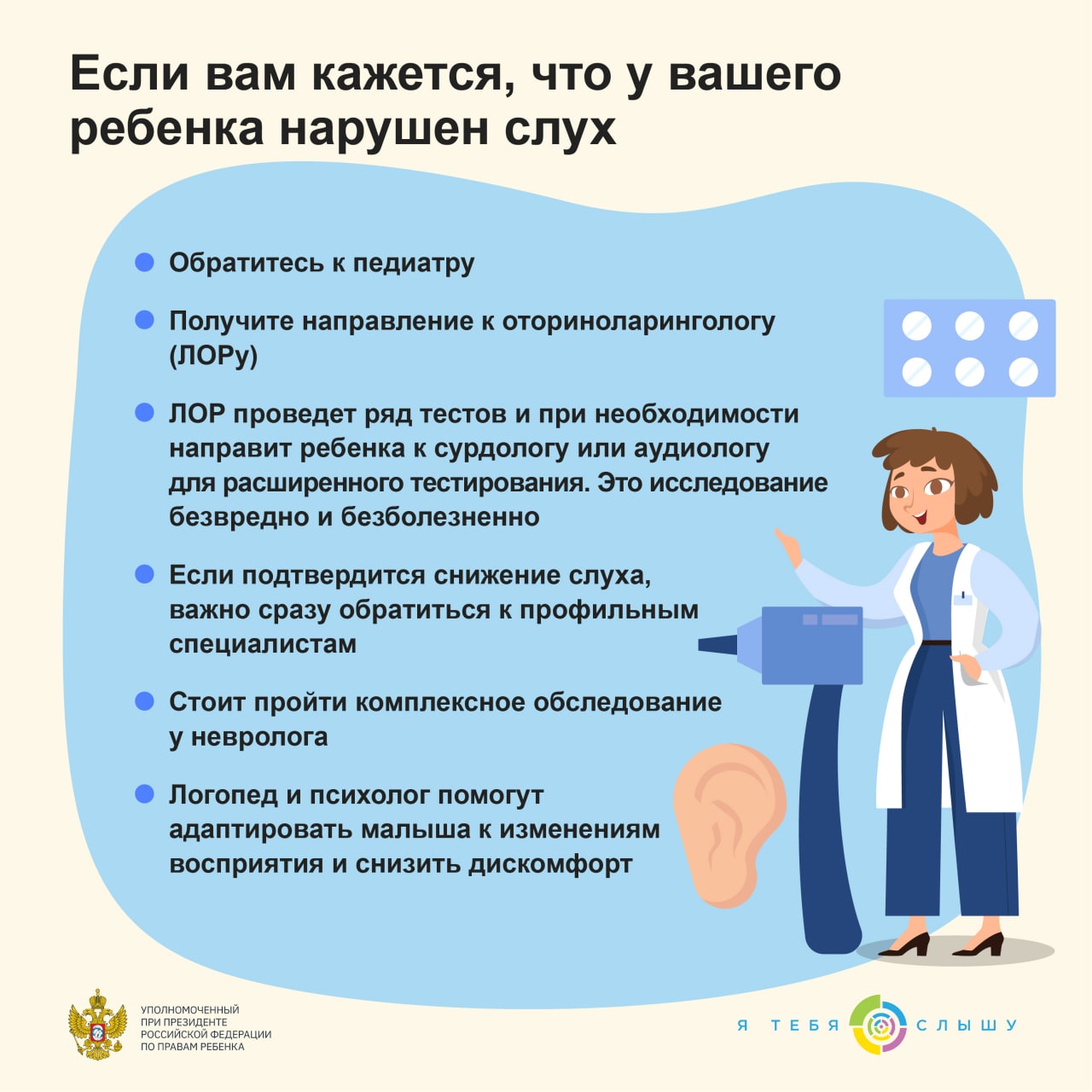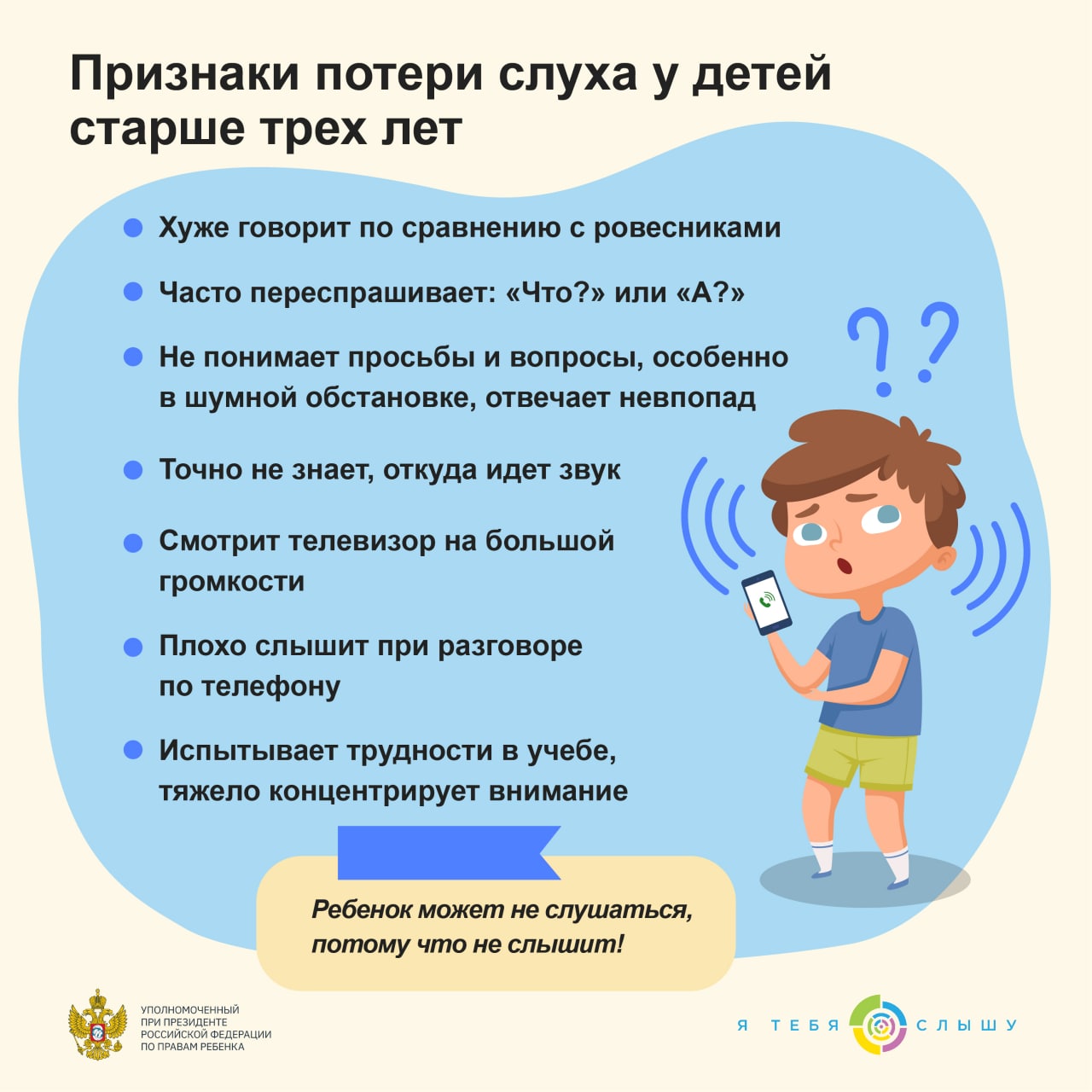 Уполномоченный по правам ребёнка в Калужской области Ирина Агеева поделилась в своём телеграм-канале обучающими карточками, которые рассказывают родителям о том, как диагностировать и лечить потерю слуха, а также как его сохранить.