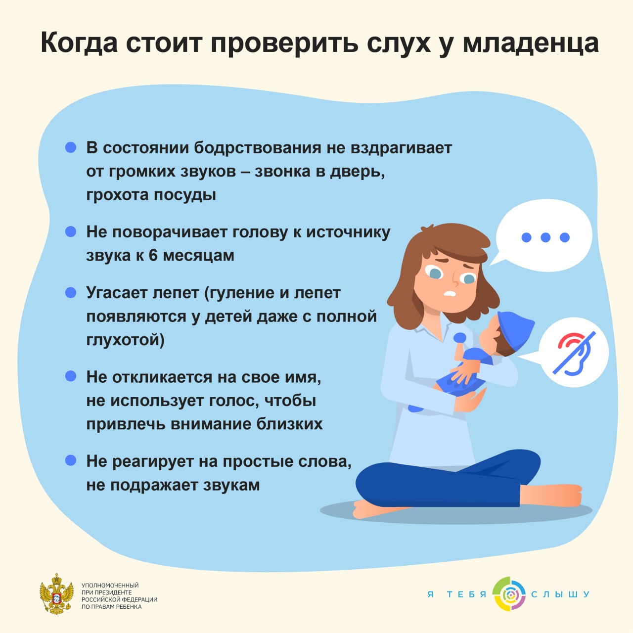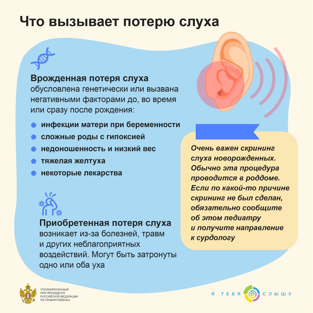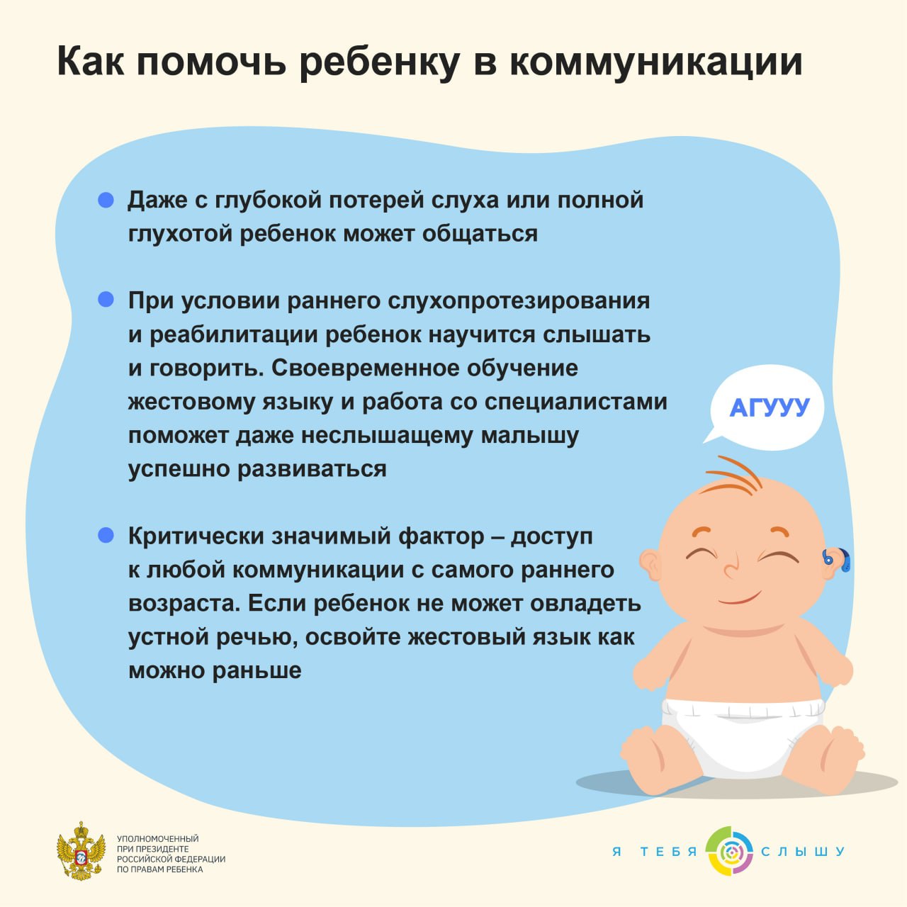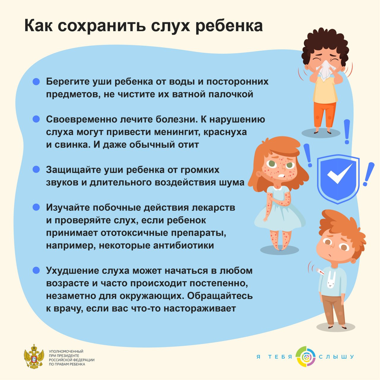 Уполномоченный по правам ребёнка в Калужской области Ирина Агеева поделилась в своём телеграм-канале обучающими карточками, которые рассказывают родителям о том, как диагностировать и лечить потерю слуха, а также как его сохранить.
