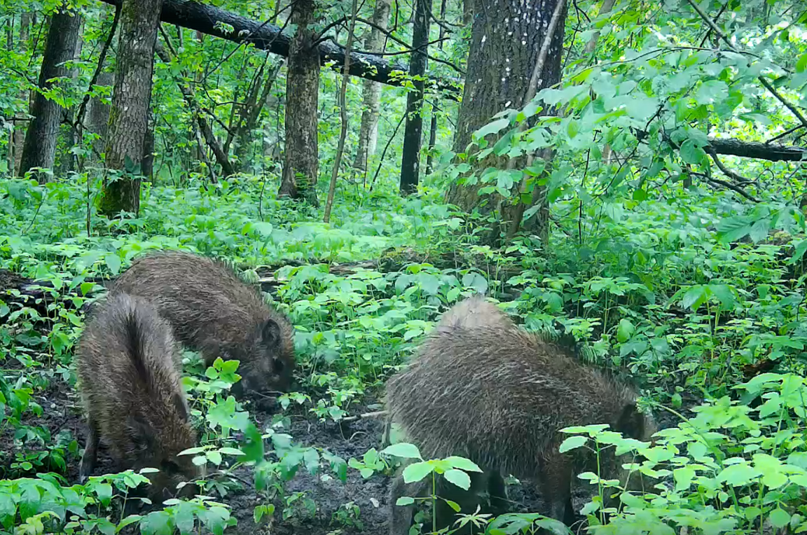 «Калужские засеки» опубликовали видео, записанное одной из фотоловушек этого заповедника». В объектив попали полосатые кабанчики, роющие пятачками землю в поисках еды: