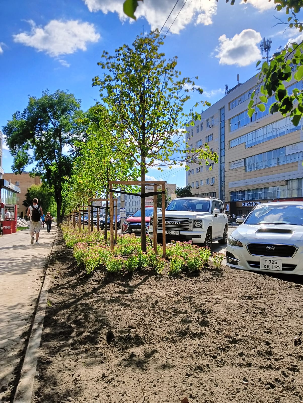 «В период посадки крупномеров в условиях повышенной температуры воздуха нами были приняты все меры для их приживаемости включая тщательный полив и подкормку антистрессовыми препаратами под корень и обработка по кроне».