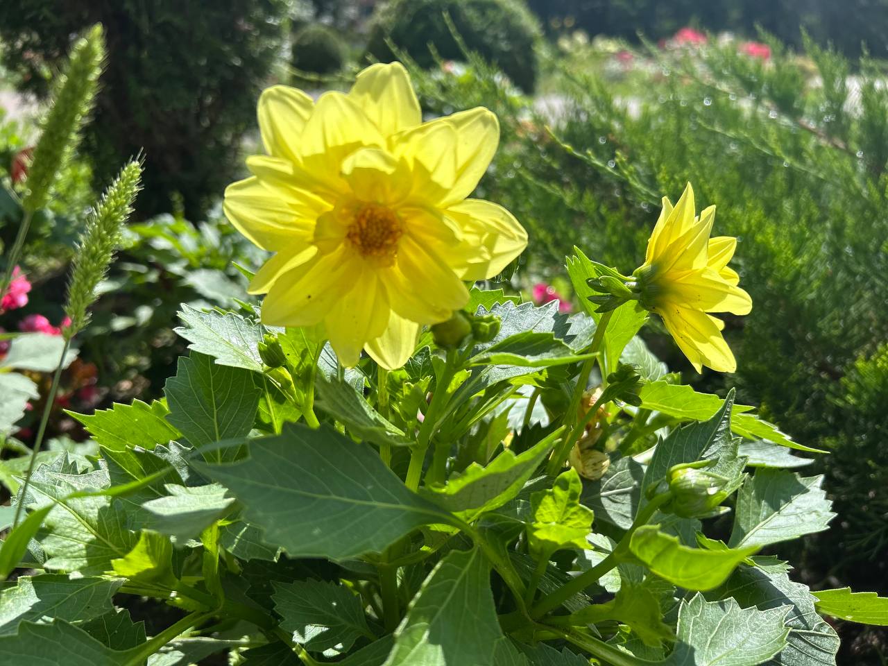 В сквере Мира настоящее буйство красок, словно умелый художник смешал на палитре акварели: кремовые и коралловые розочки, белые, красные, золотистые георгины с подходящим названием «весёлые ребята», алые цветы сальвий. Над медовым цветником неустанно жужжат пчёлы и шмели, кружатся красавицы-бабочки. Из пушистых шапок гортензий, будто из облаков, смотрит в небо Константин Циолковский с взлетающей позади стальной ракетой. Сложно оторвать взгляд от этой красоты.
