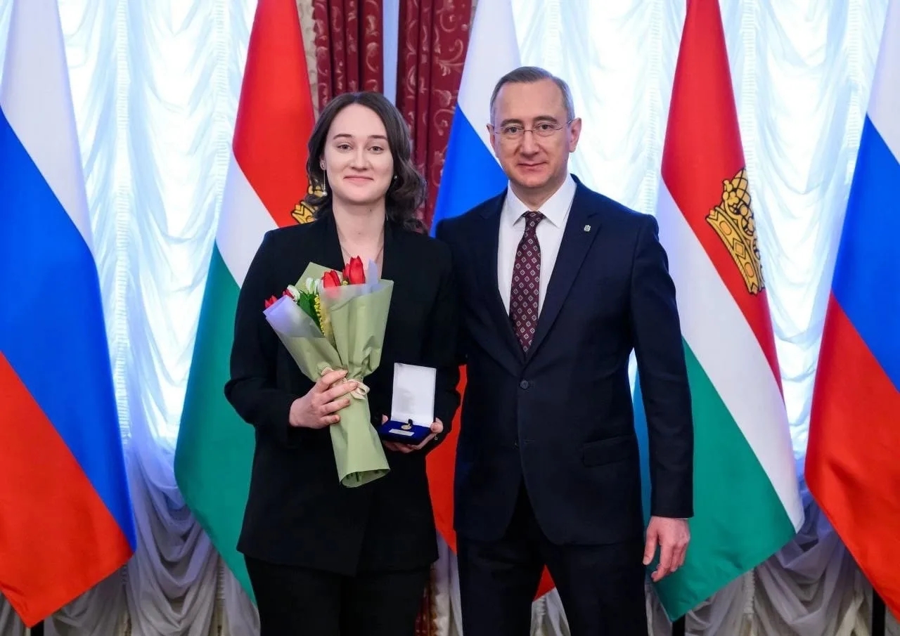 7 марта 2024 года. Губернатор Владислав Шапша вручает студентке института педагогики Александре Родионовой Почетный знак им. Е. Р. Дашковой.