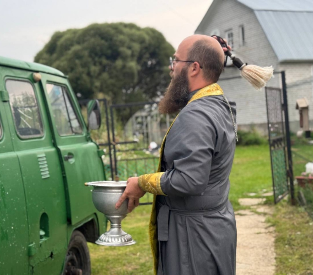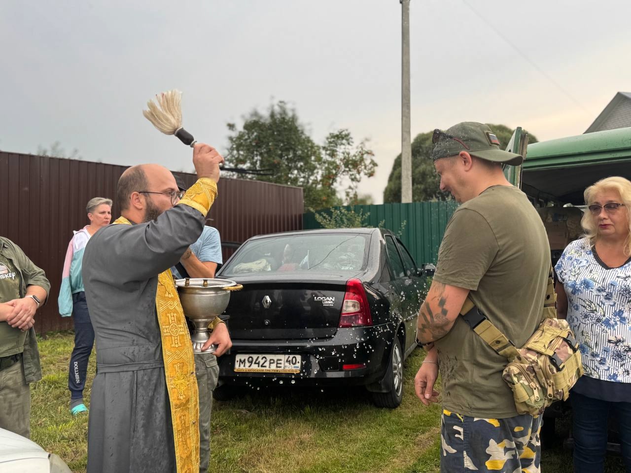 Батюшка вместе с жителями деревни помолился за бойцов и за волонтеров, чтобы те спокойно отвезли гуманитарную помощь. Отец Илья освятил машину на ратные подвиги и окропил святой водой команду «VМЕСТЕ Калуга», благословив их на дорогу. Провожая волонтеров, сказал просто: