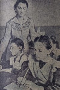 На фото: Молодой учитель литературы, выпускница Московского педагогического института имени Ленина В. М. Чернякова с пятиклассницами.