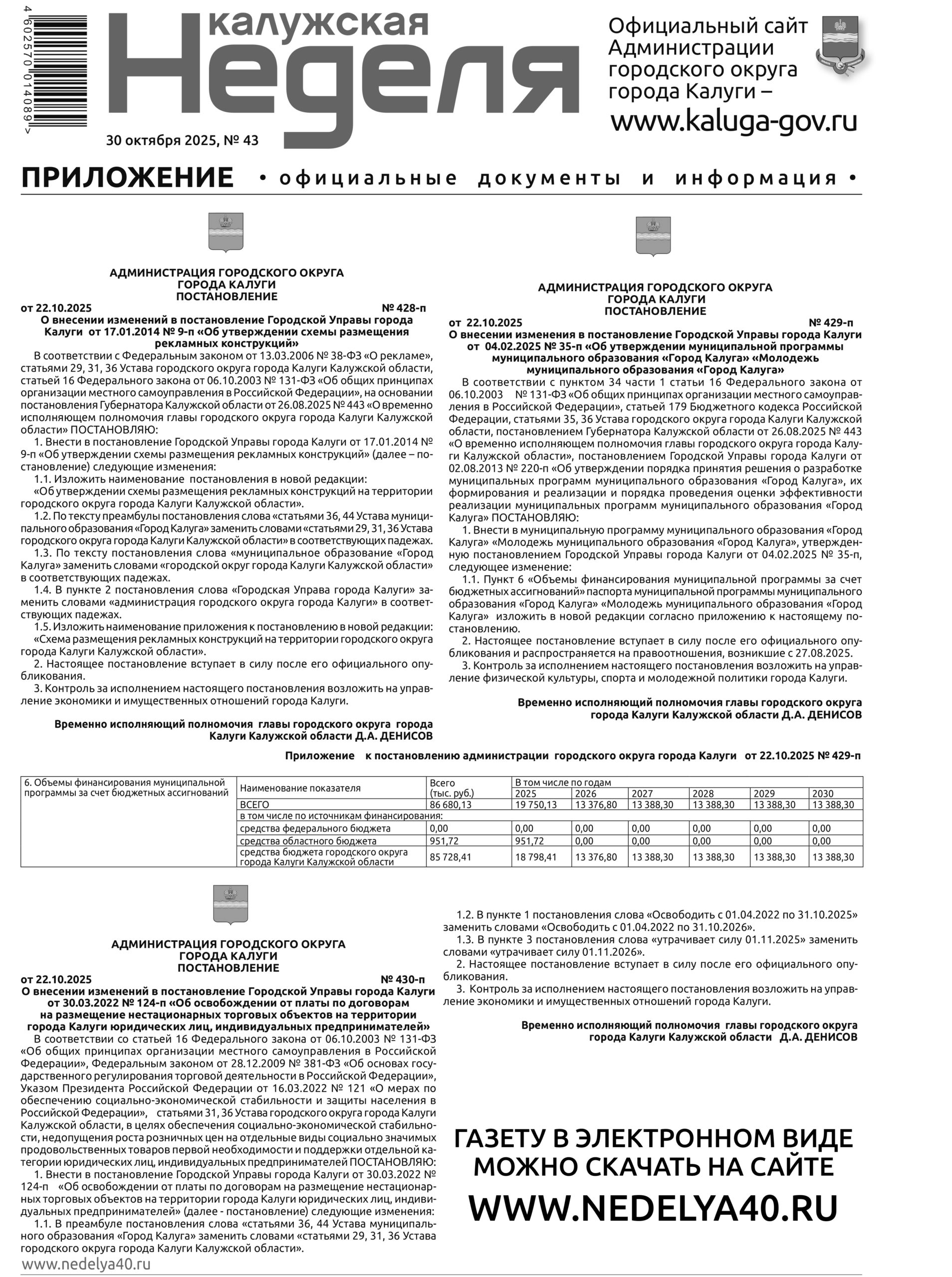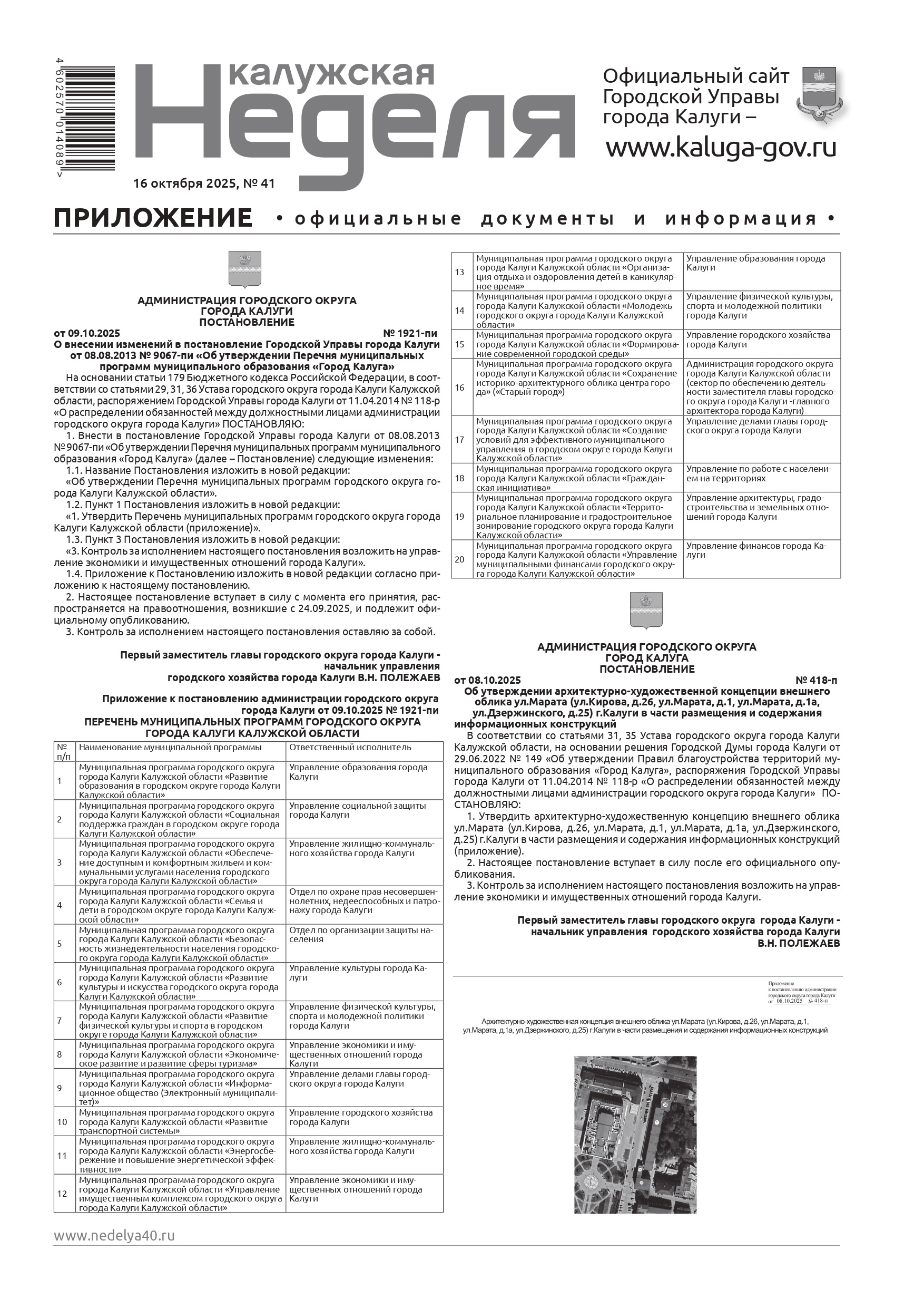 Архив приложений к еженедельной газете «Калужская неделя». Все выпуски в формате PDF можно бесплатно скачать на этой странице. Постановления Городской Управы и Городской Думы города Калуги, официальные заявления и опубликованные документы.