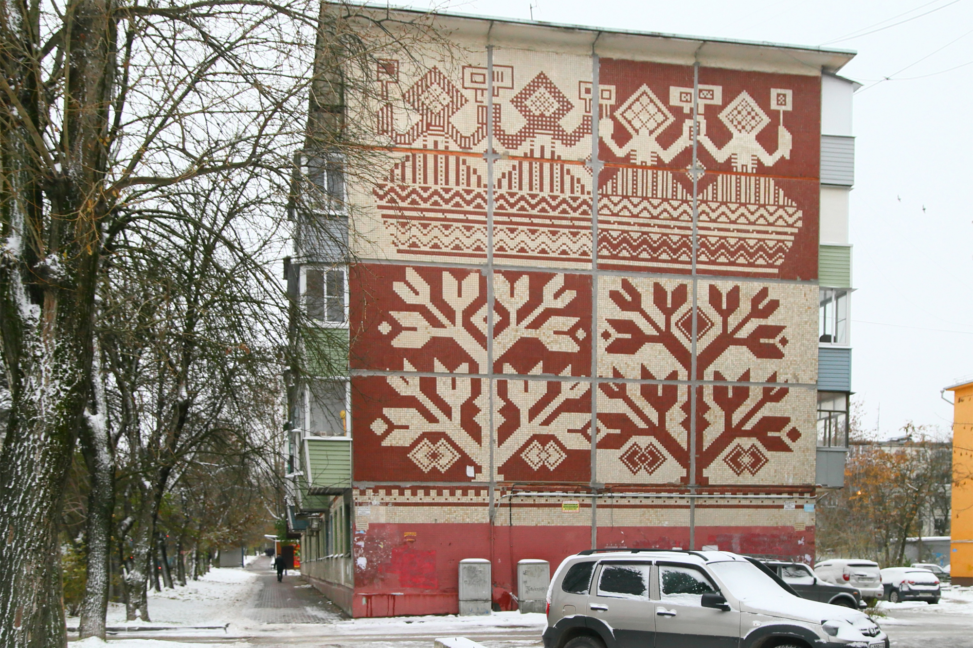Сегодня на фасаде многоэтажек на улице Степана Разина можно увидеть восьмилепестковые розетки – специфический «солярный» знак, символизирующий одновременно солнце и огонь. На «вышитом» доме на улице Ленина, 37 – фрагмент крестьянской свадьбы: два всадника с приданым и танцующая женщина с цветами в руках. А изящные хвостатые птицы-павы, символ тепла, света и богатства, на соседнем доме уже утрачены. Зато «куколки», символизирующие богиню жизни и раскидистые деревца с геометризированными контурами, – «сад жизни», источник жизненной силы и символплодородия, – смотрят с фасада дома 17 на улице Карла Либкнехта.