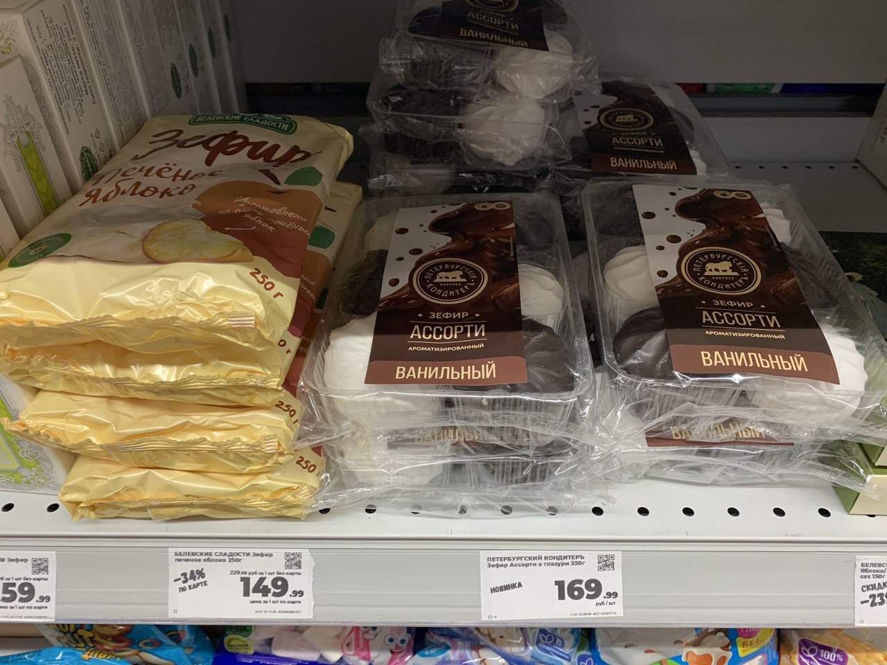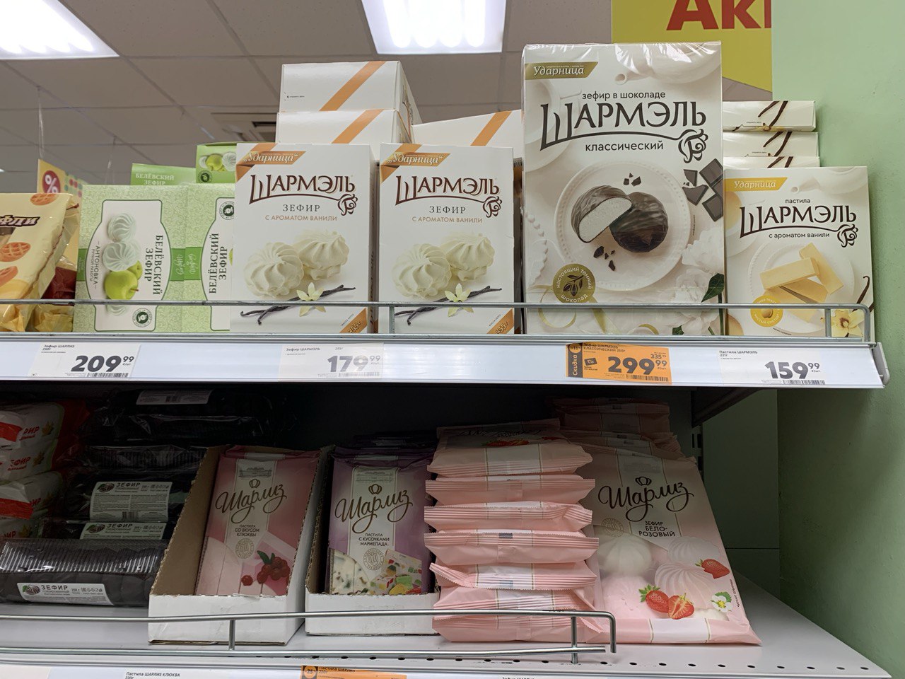 20 марок зефира: «Умные сладости», «Зеленая линия», «Лянеж», «Коломенское», «Ашан», «Шармэль», «Моя цена», «Сладкие истории», «Жизель», NEO botanica, «ВкусВилл», NanoFit, «Сибирь», «Семейка ОЗБИ», «Ударница», «Меренга», «Хороший день», Belucci, Ozon и «Белевский зефир».