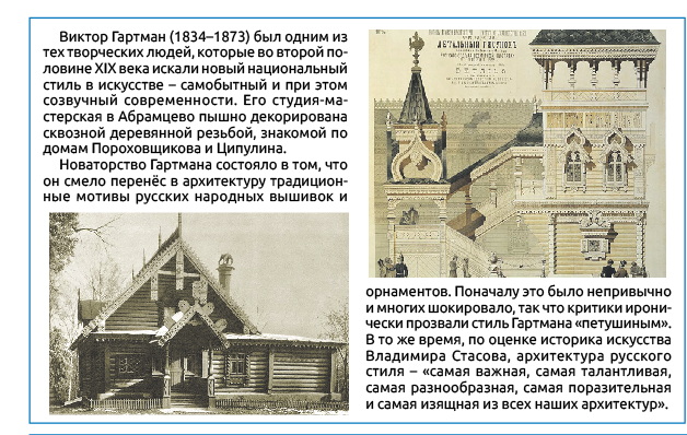 Так называемый русский стиль, хотя и вырос на народной почве, – безусловно, вид искусства, порождённый художественной элитой того времени, которая вдруг осознала, насколько велико и прекрасно народное искусство. Увидели, восхитились, вдохновились. И какой же интересный ответ получился! К примеру, наличники. Это явно не народные промыслы, а искусство профессиональных художников, вдохновлённых темами, мотивами и формами народного искусства. Или «капители» с мотивом птиц – явная переработка версий, заимствованных из народной вышивки.