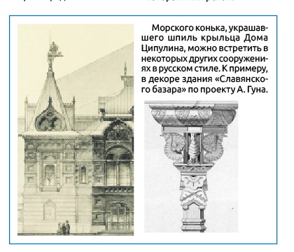Дом Ципулина построен по так называемому проекту повторного применения, по заимствованной идее: похож, но не идентичен, по обилию разнообразных резных деревянных украшений чувствуется схожесть с домом на Арбате. Хотя в некоторых деталях видна прочная мифологема связи –