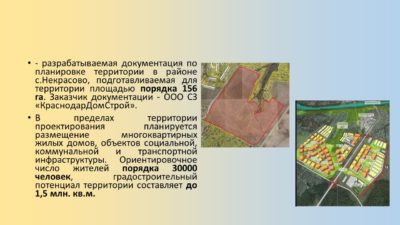 Разрабатывается документация по планировке территории в районе села Некрасово. На 156 га планируется разместить многоквартирные жилые дома, объекты социальной, коммунальной и транспортной инфраструктуры.
