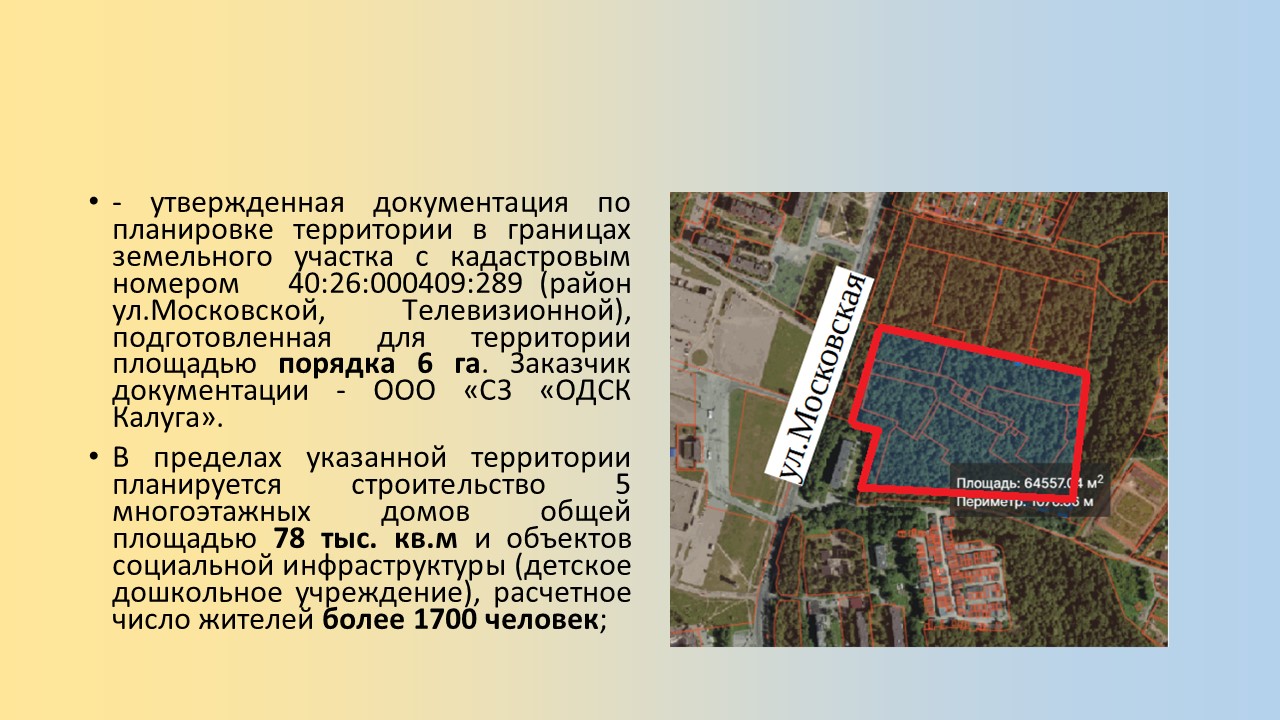 Утверждена документация по планировке территории в районе ул. Московской. Заказчик документации – ​ООО «СЗ «ОДСК Калуга». В пределах 6 га планируется строительство пяти многоэтажных домов общей площадью 78 000 кв. м и объектов социальной инфраструктуры – ​детского дошкольного учреждения.