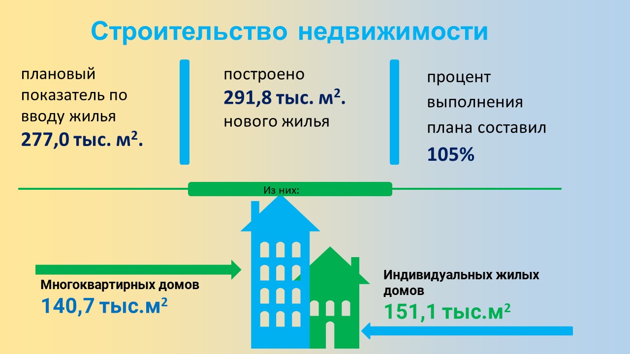 – В 2025 году областное министерство строительства и жилищно-­коммунального хозяйства установило плановый показатель по вводу жилья – ​277 000 кв. м. Поставленную задачу мы выполнили в полном объеме и даже перевыполнили – ​построено почти 292 000 кв. м жилья. Введен 21 многоквартирный дом – ​почти 140,7 тыс. кв. м, 2 367 квартир и чуть больше 151 000 кв. м объектов индивидуального жилищного строительства.