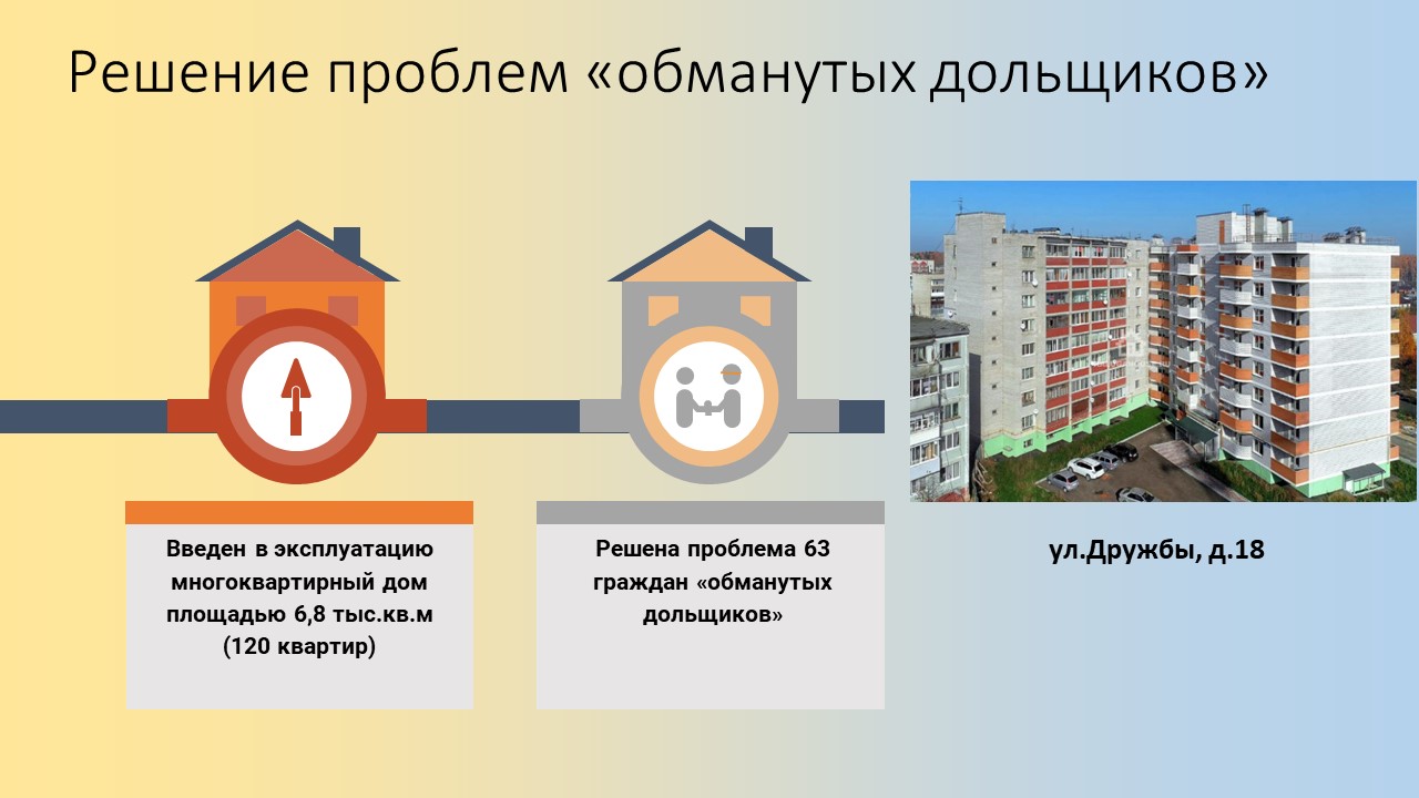 – Мне приходилось присутствовать на встрече главы Калуги Дмитрия Денисова с обманутыми дольщиками, где и вы также обнадежили людей, вложивших деньги в строительство жилья на нулевом этапе. Как обстоят дела с этой проблемой?