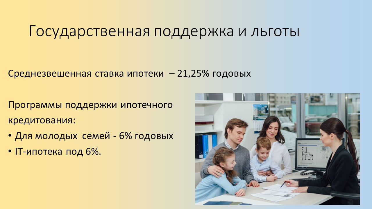 – В настоящее время ставки по рыночной ипотеке превышают порядка 21–22 % годовых. Государство предоставляет субсидии на выплату процентов по ипотеке для определенных категорий граждан. Одна из самых широких программ с гос­поддержкой, которая была доступна россиянам в 2025 году, – ​семейная ипотека. Получить льготный кредит на покупку жилья могли также и работники IT-компаний. Эти меры помогают снизить финансовую нагрузку на заемщиков и сделать жилье более доступным.