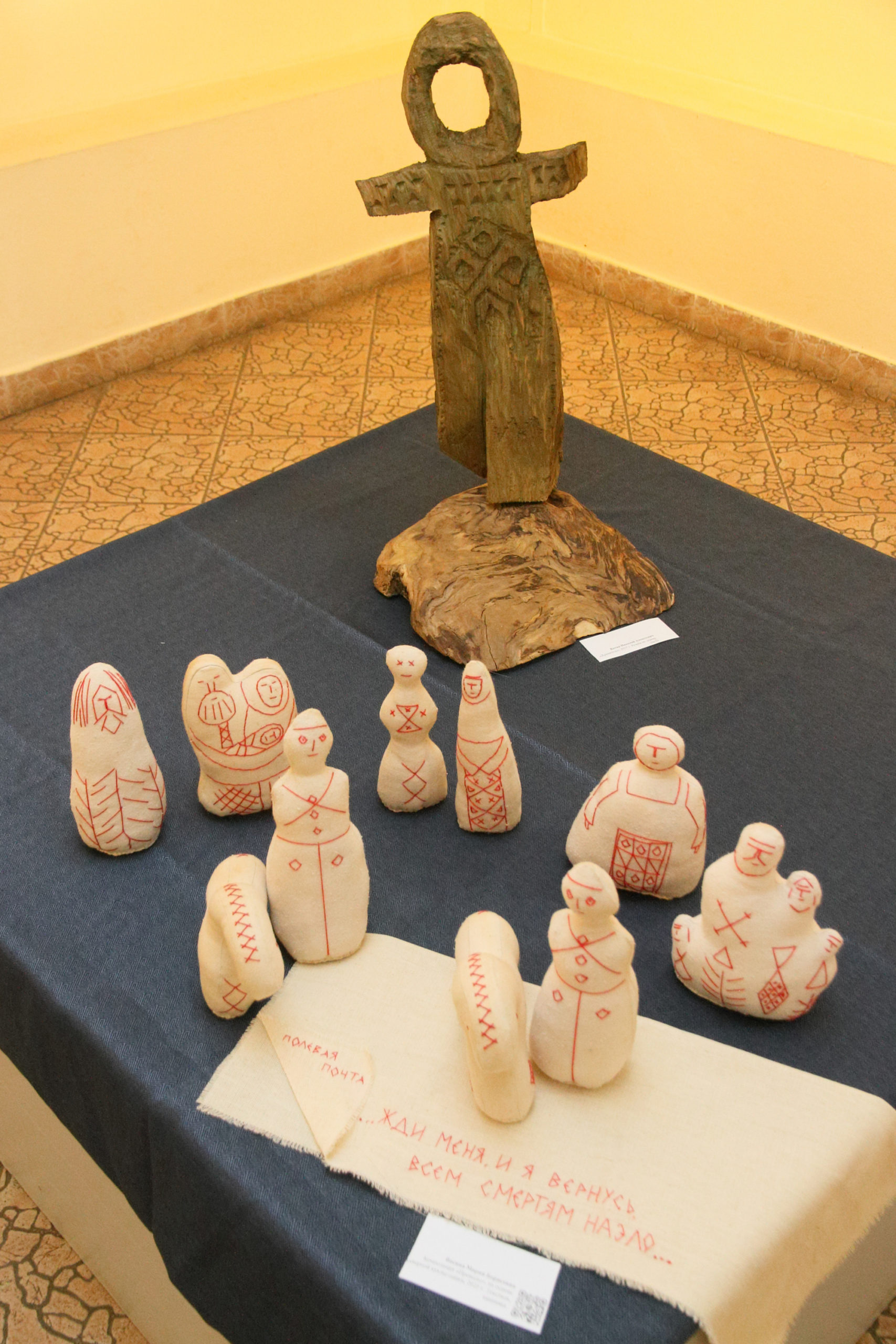 В своей текстильной технике Мария Васина сделала и северных кукол-панок, которых традиционно вырезают из дерева. Получилась трогательная и очень актуальная композиция, дополненная вышитой строчкой из знаменитого стихотворения Константина Симонова. Во все времена мужчины шли защищать родную землю, а женщины ждали их.