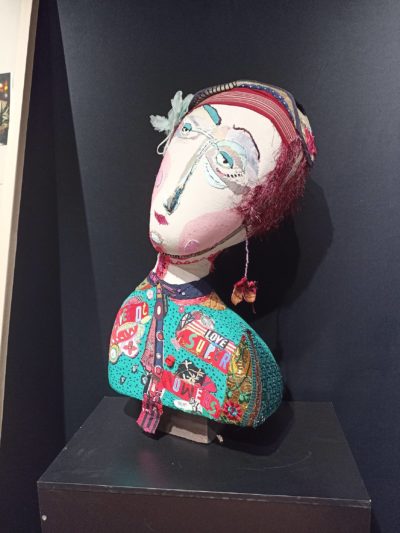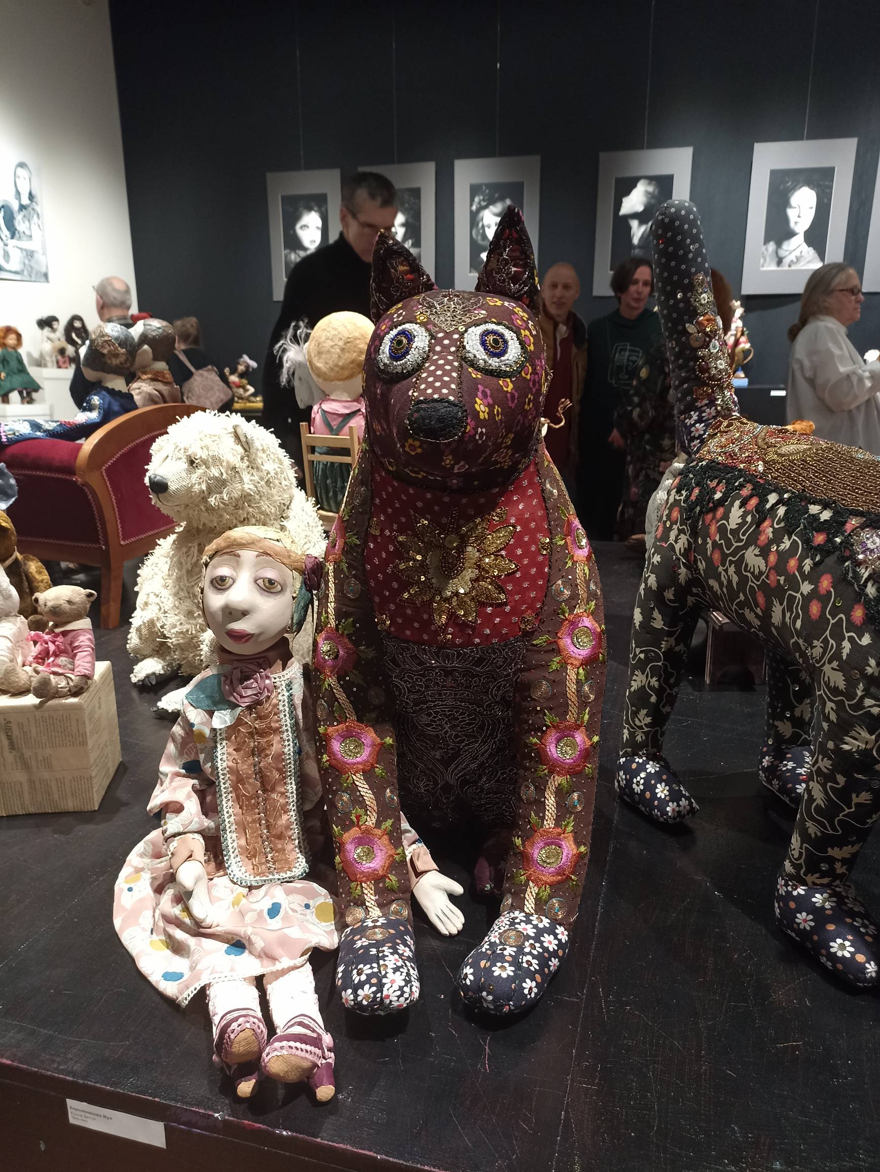 Иногда работы разных авторов словно находят друг друга в экспозиции. Так «подружились» нежная, меланхоличная кукла Бетти Ирины Барышниковой и фантазийная «Собака-Земля» Ольги Постальчук – что‑то общее есть в выражении их лиц, и даже элементы декора неожиданно рифмуются.