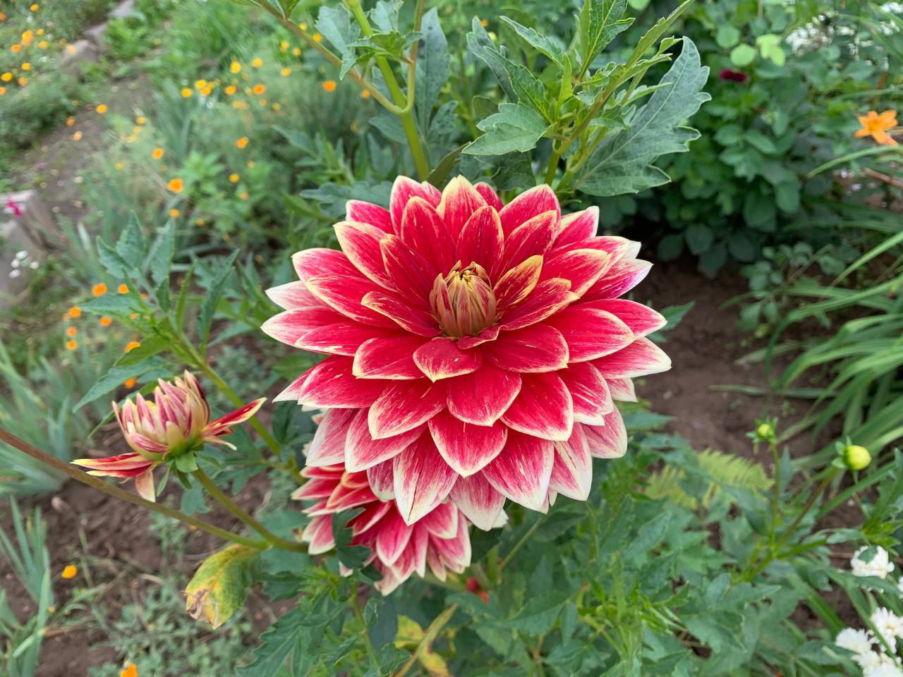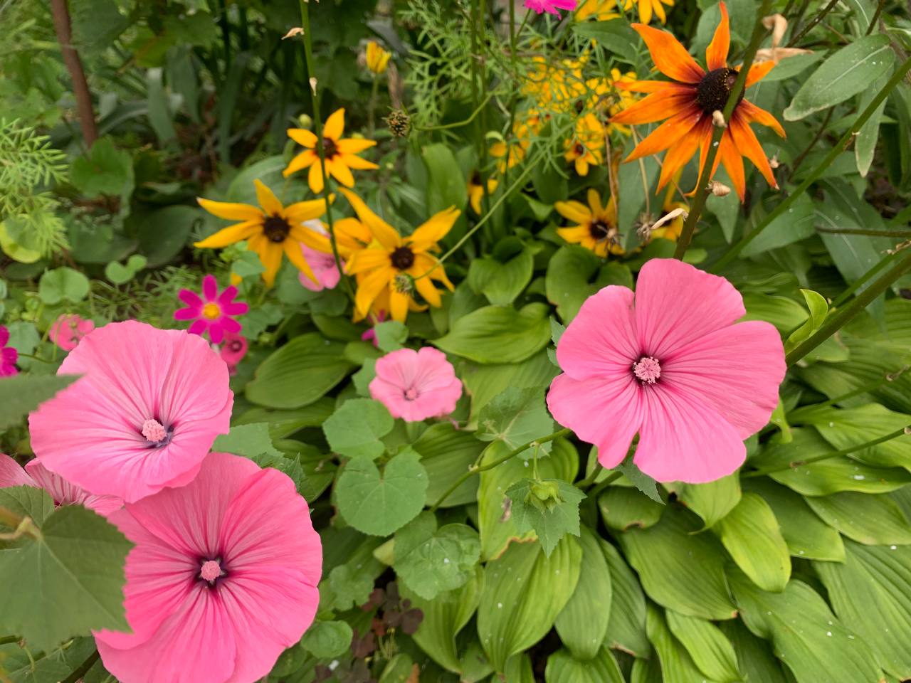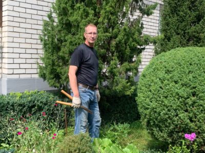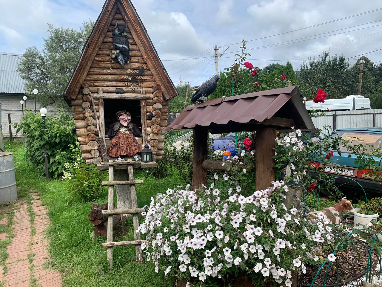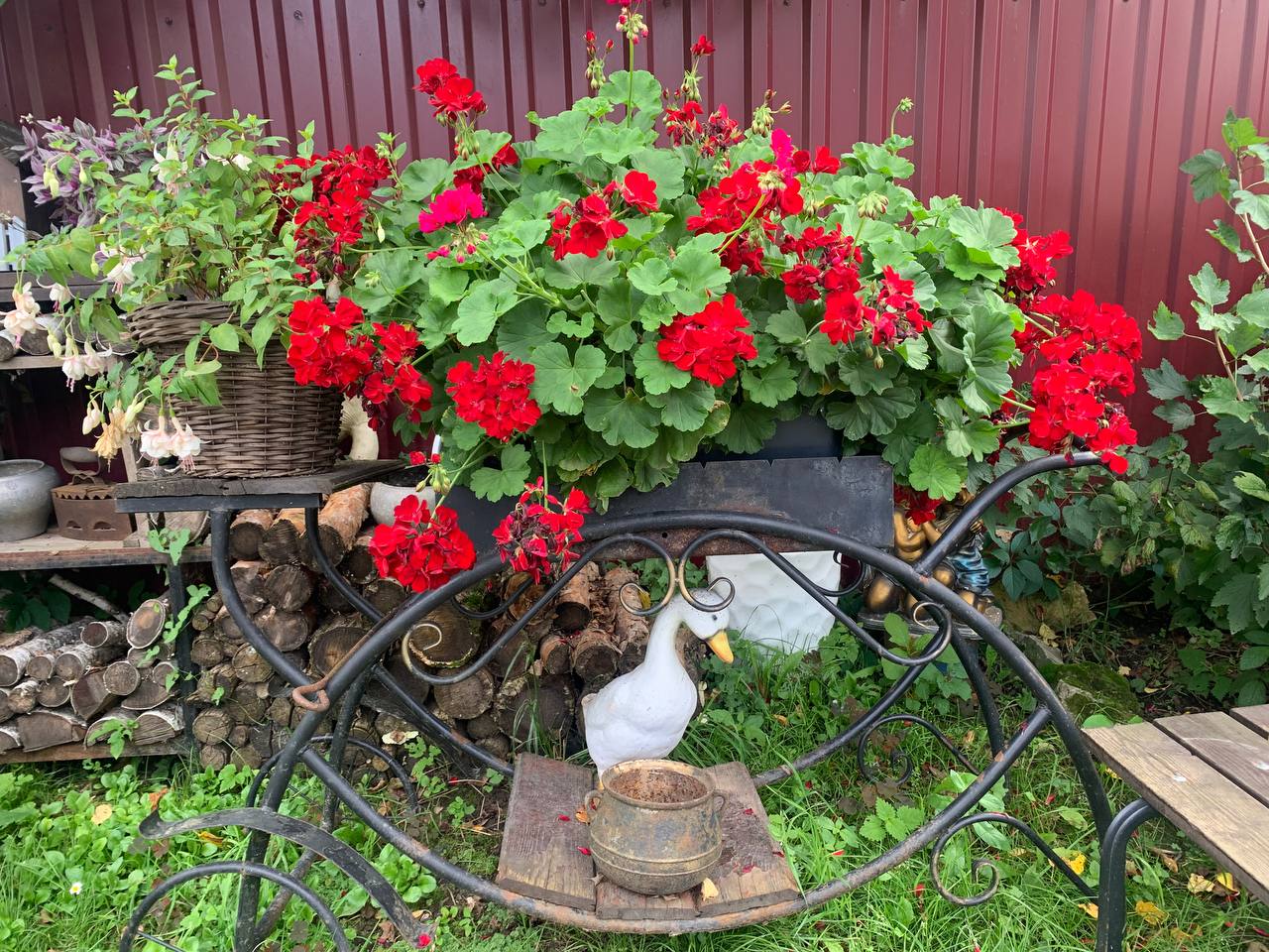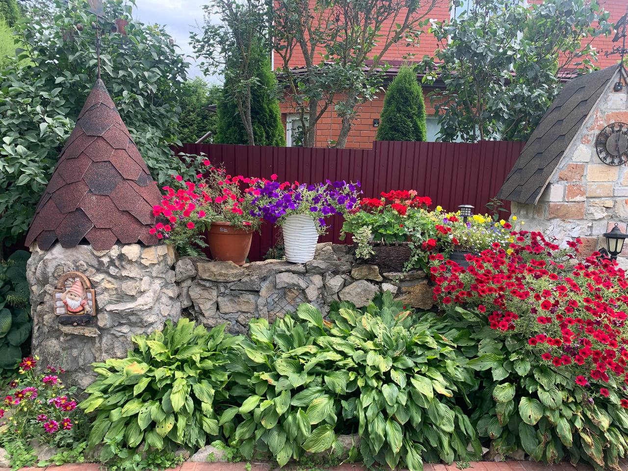 Мужчина активно помогает своей жене выращивать разнообразные декоративные культуры: рудбекии, флоксы, хосты, барбарисы, туи и другие растения. Особая гордость – круглый куст можжевельника, который он аккуратно формирует ножницами.