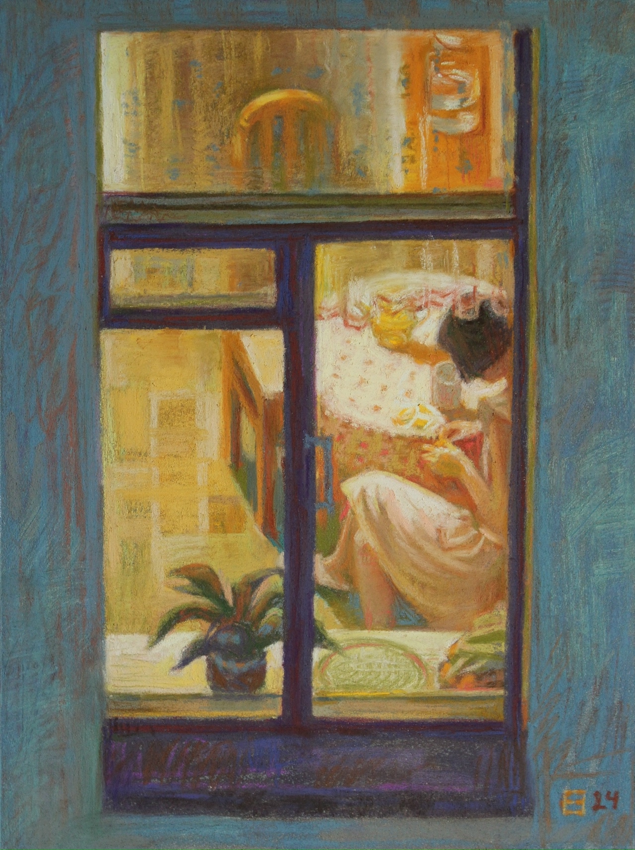 Вместе с художницей зритель мимоходом заглядывает в ярко освещенное окно, становится свидетелем уединенного вечернего чаепития у круглого стола. Вспоминаются строки Натальи Головатюк: «Мамино время после полуночи».