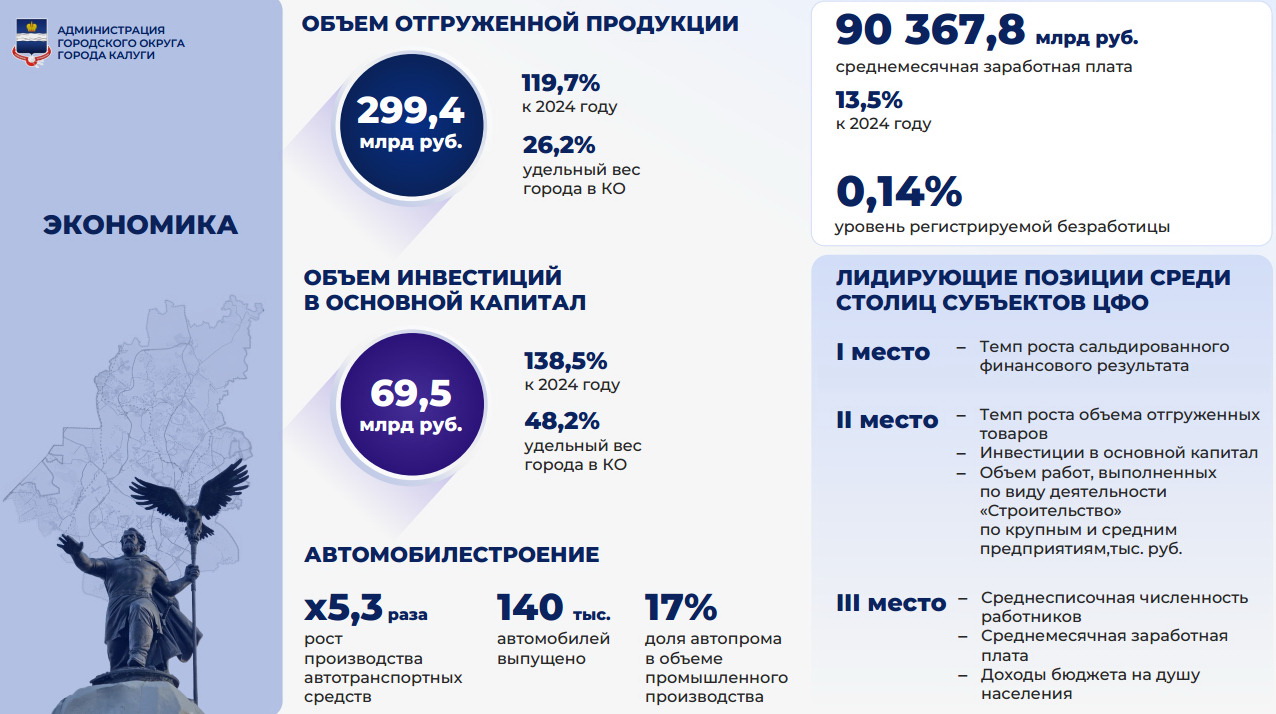 За 2025 год инвестиции в основной капитал крупных и средних организаций на территории города составили 69,5 млрд рублей, что составляет 138,5 % от уровня аналогичного периода 2024 года. Доля города в общем объеме инвестиций Калужской области составляет почти половину – 48,2 %.