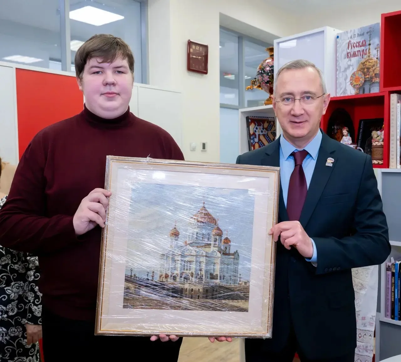 — Познакомился с воспитанником школы «Гармония» Максимом. Своими руками он вышил на холсте Храм Христа Спасителя. Тонкая, кропотливая работа. Максим попросил передать ее Президенту. Постараюсь выполнить,