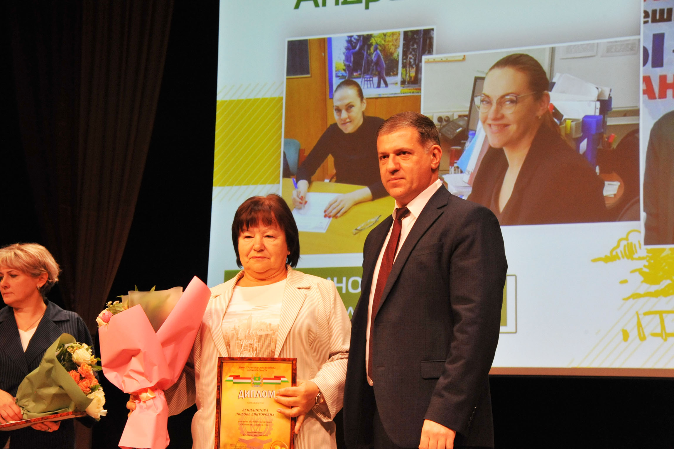 Глава Минсельхоза Александр Ефремов вручил награду Любови Венедиктовой из поселка Мятлево Износковского округа. Она получила максимальный балл в номинации «Хозяйка-наставница». В этой номинации состязались главы администраций сельских поселений и другие руководители.