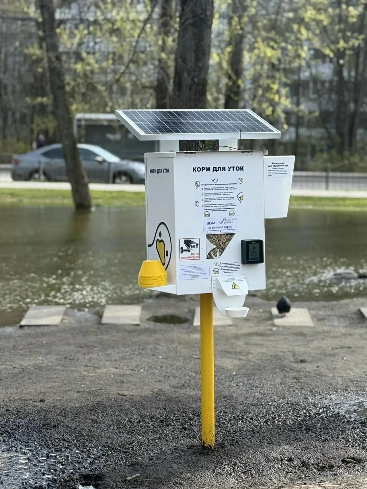Уток, живущих у пруда в сквере Содружество,  теперь можно будет покормить с помощью уткомата на солнечных батарейках. Его установили на берегу пруда. Стоимость порции – 25 рублей.