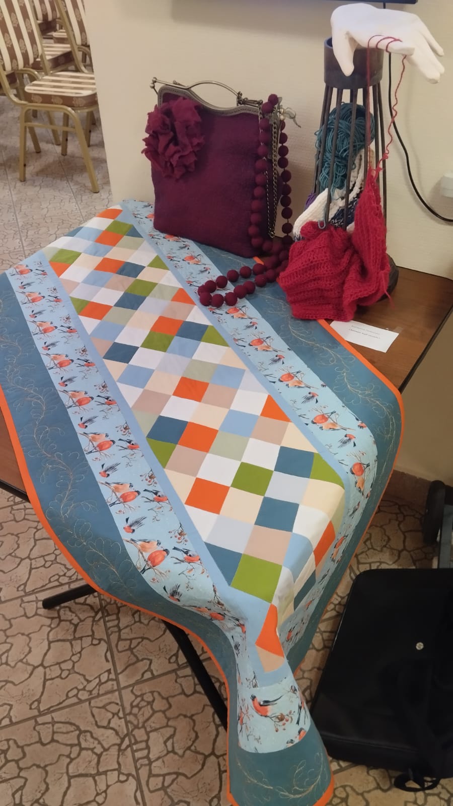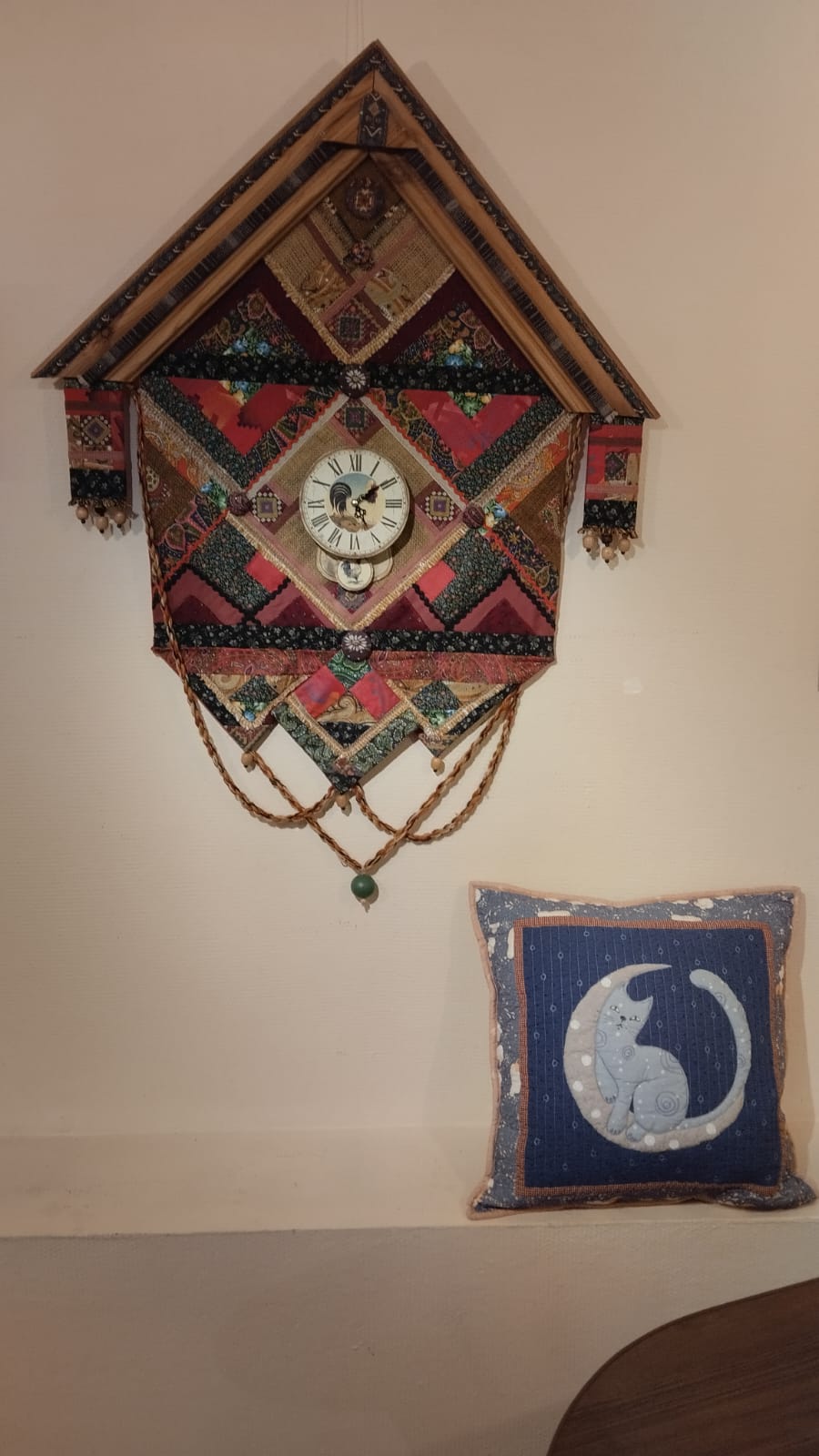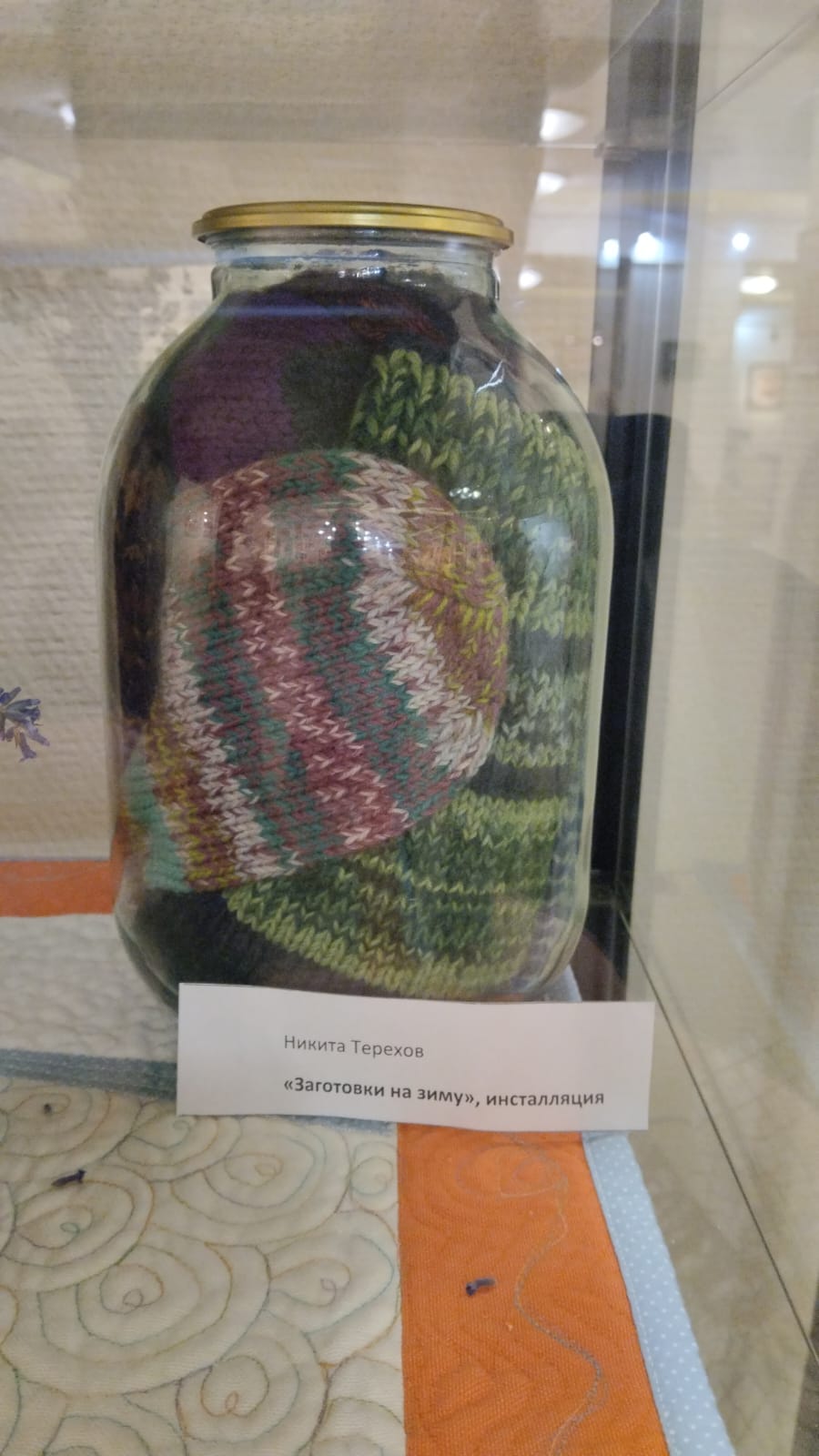 Экспозиция многообразная. Здесь представлены живопись, изделия из холодного фарфора и в технике сухого валяния, одеяла, подушки, тканевые композиции, книги, ну и сами заготовки, конечно, — для экспозиции жители Калуги любезно предоставили настоящую консервацию. Выделяется на этом фоне банка с консервированными… носками. Так автор видит важные зимние запасы.