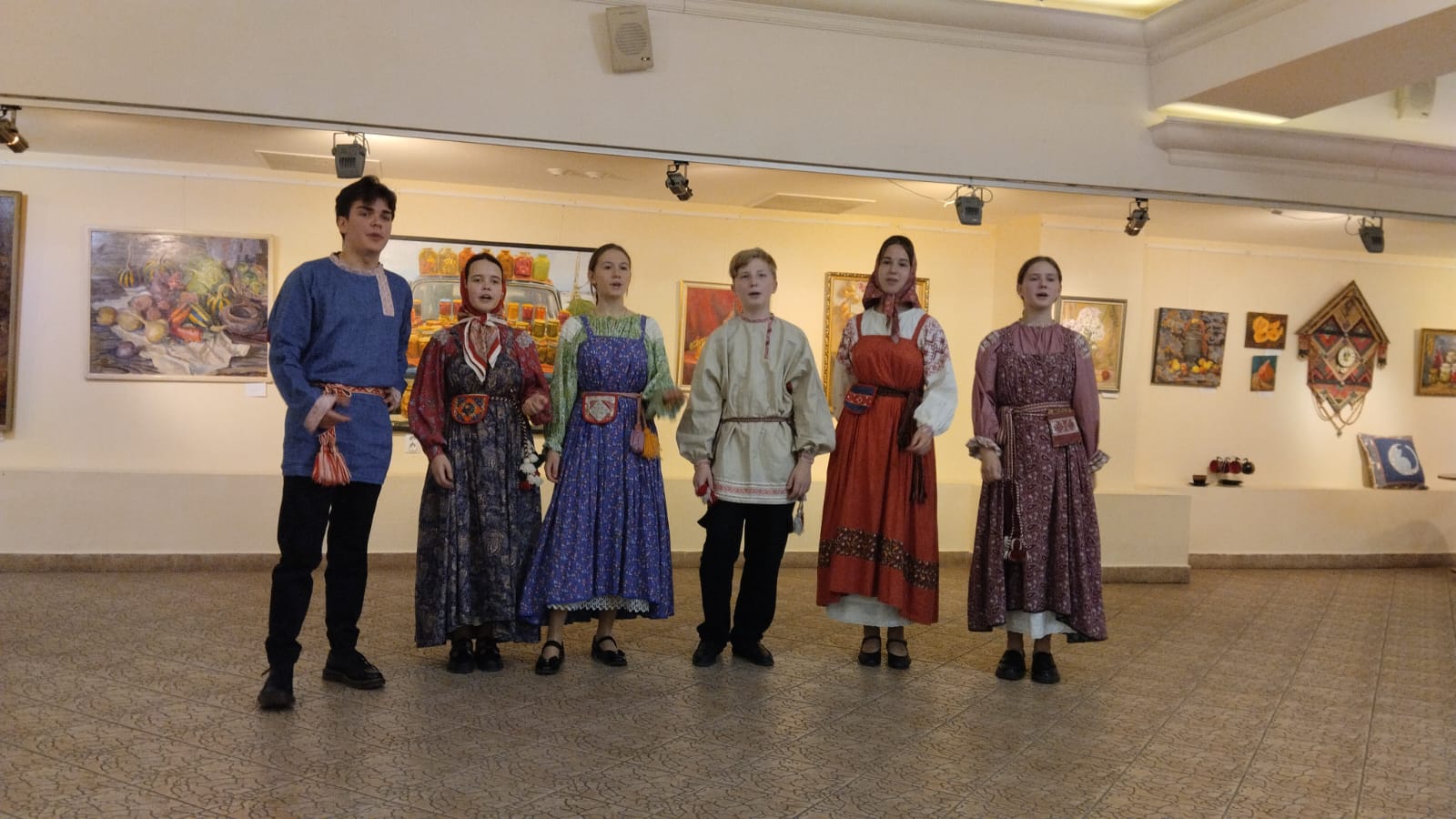 Вернисажи от Дома музыки надо не только видеть, но и слышать. Сегодня музыкальные подарки для гостей подготовила старшая группа фольклорной студии «Параскева» центра «Достояние» под руководством Ольги Кондратьевой. Они исполняли русские народные песни.