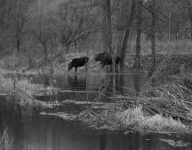 В «Калужских засеках» запечатлели неспешную прогулку двух крупных лосей.