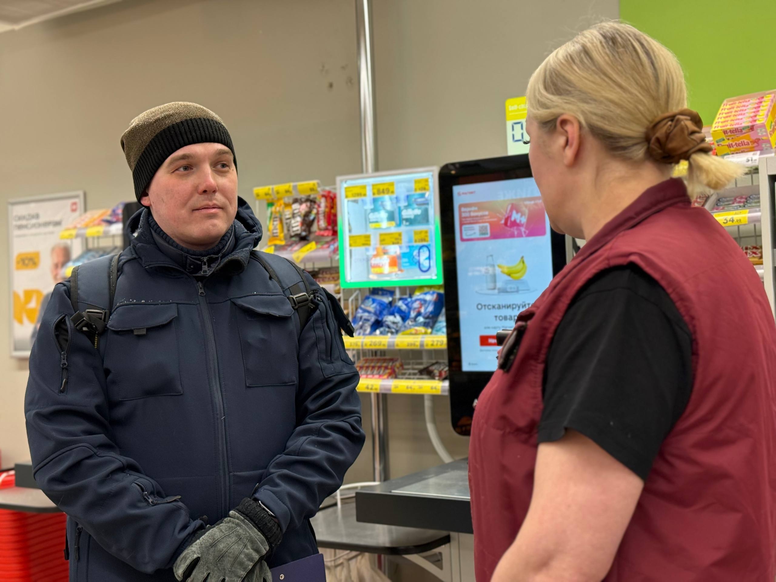 Как раз в этот момент мы подходим к тому самому «Магниту», на который жаловались жители. У входа относительно чисто, но Михаил все же решает зайти и переговорить с руководством на всякий случай. Директор магазина, увидев знакомого члена комиссии, вышла сама. Разговор неизбежно заходит о наказаниях. Михаил Ходин четко перечисляет цифры: