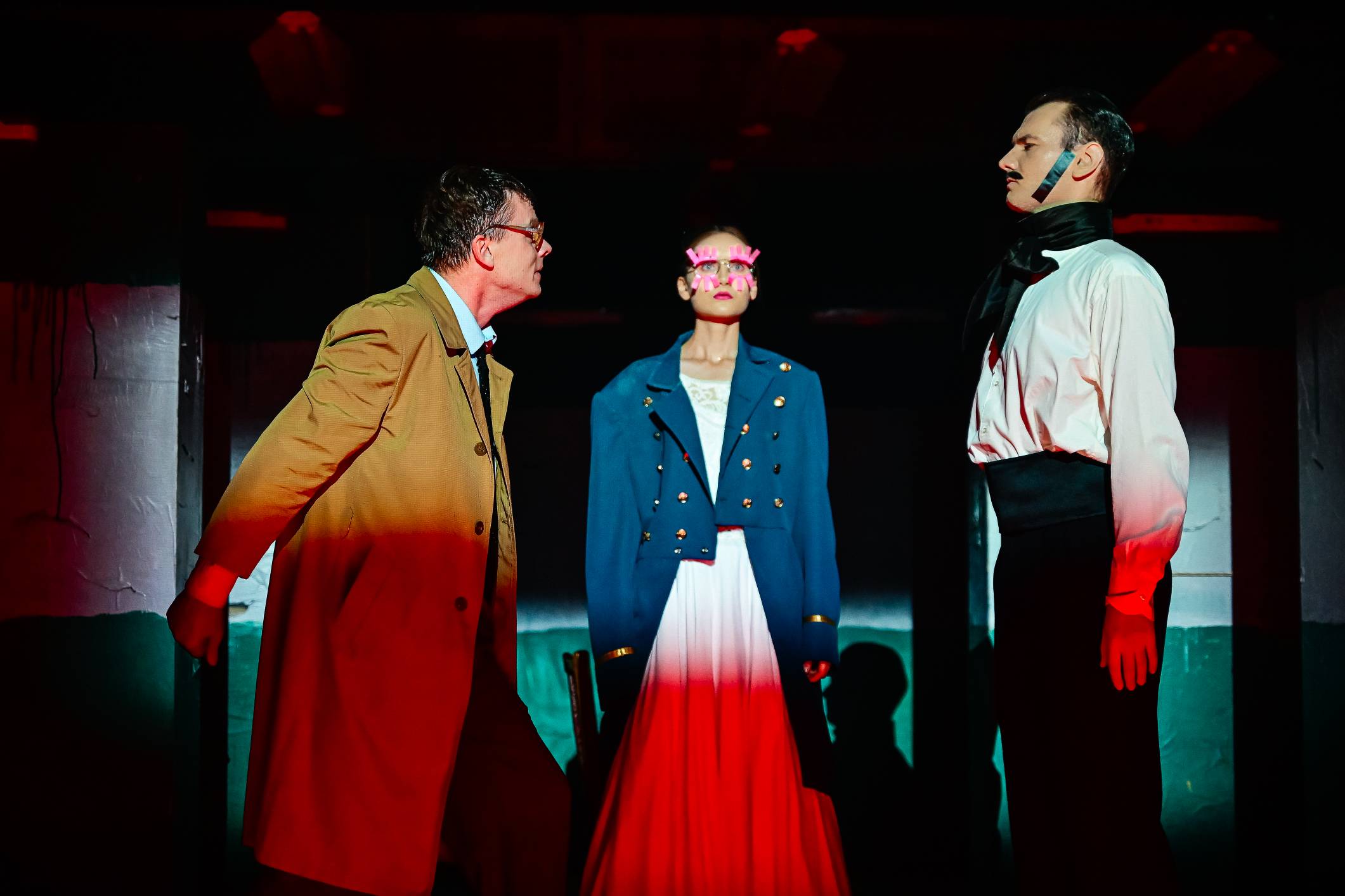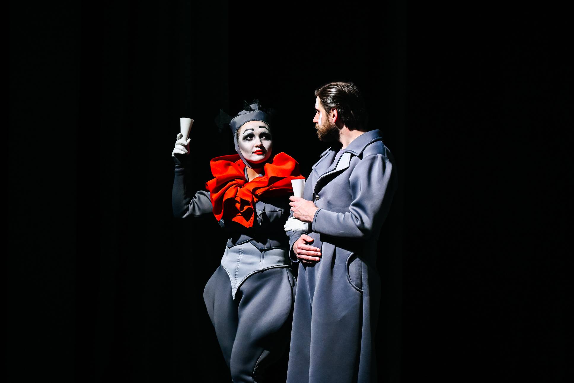 Костюм Настасьи Филипповны (Карина Мостовая) особо подчеркивает соблазнительные формы, сапожки и боа – рокового красного цвета. Характерным жестом она обозначает корону на голове, говорит волнующим грудным голосом, безжалостно троллит своих обидчиков и, по-ведьмински оседлав Рогожина, уносится навстречу своей погибели.