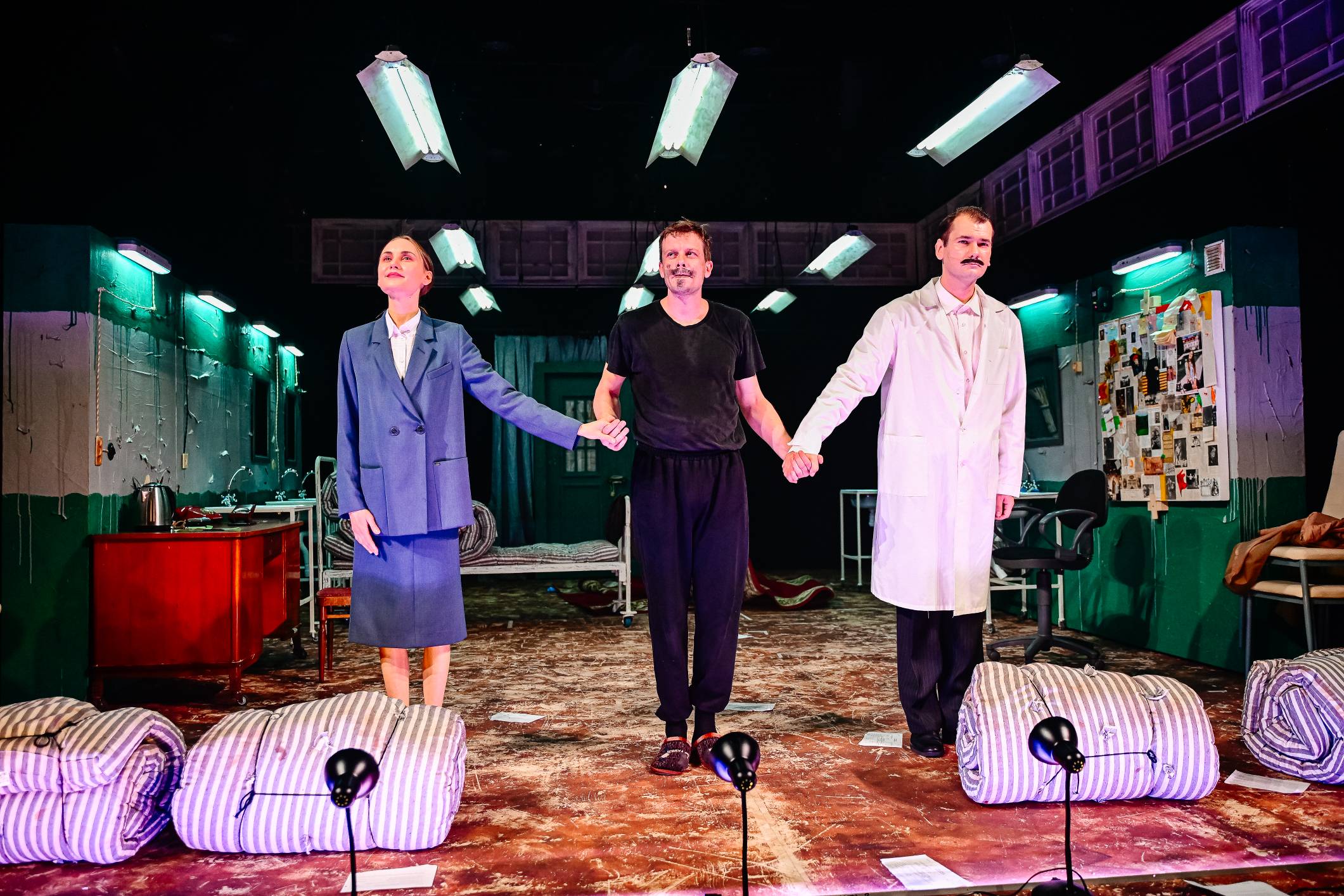 Главный герой Поприщин в исполнении Константина Вогачева – маленький человек вне времени. В пространстве спектакля как будто соединяются первая половина XIX века, середина ХХ и наши дни – среди декораций, реквизита и костюмов можно найти их приметы. Обшарпанные стены в потеках краски – то ли убогий подъезд, где в тесной квартирке обитает бедный чиновник, то ли психиатрическая лечебница, где он в итоге окажется. Звучат голоса в его голове, стучит по стакану ложечка, на стенах возникает иллюзорный мир – видеопроекции петербуржских улиц.