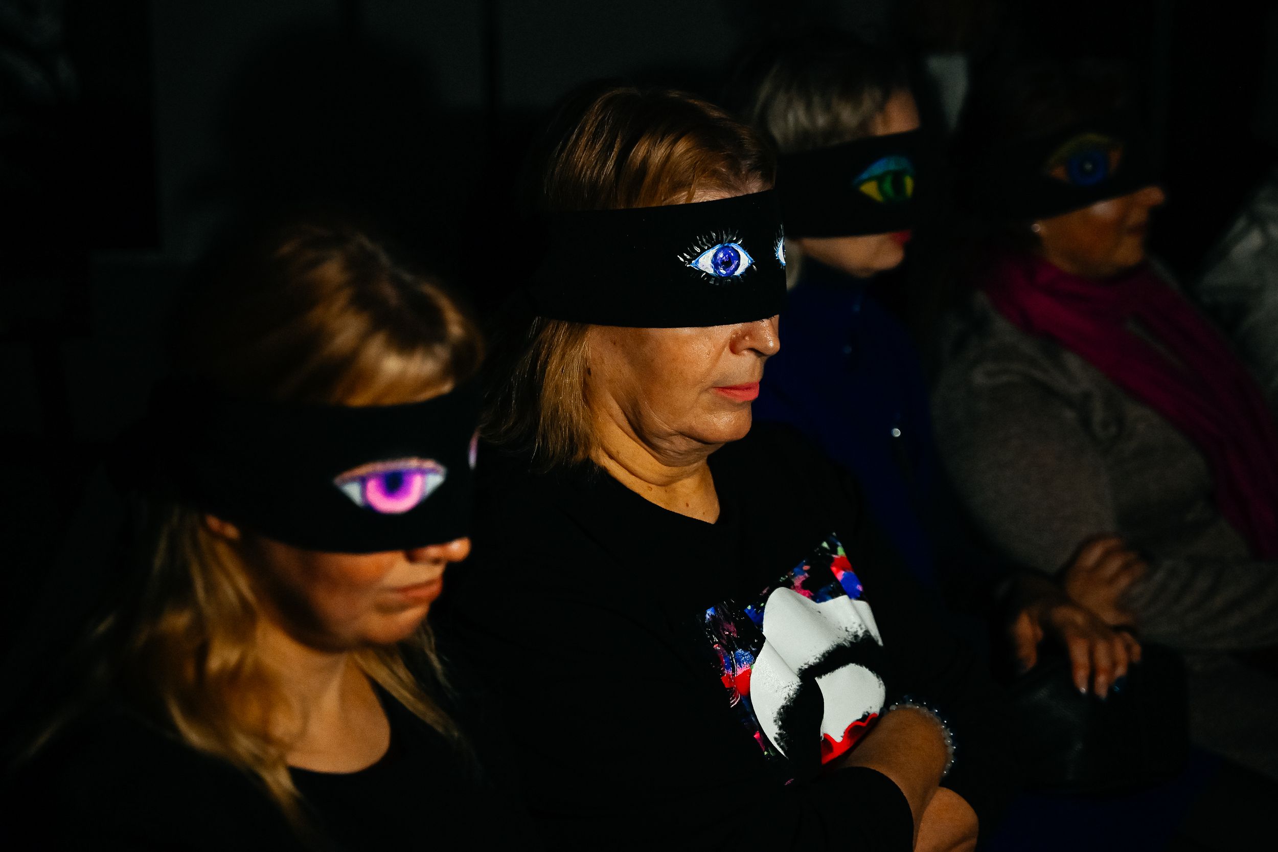 Камерное пространство выставочного зала, повязки на глазах у зрителей. Вокальный перформанс «Я тебя вижу» проходил в темноте. Сняв повязки в финале, зрители заново ощутили ценность того, что могут видеть, и увидели зеркальный шар – метафору сотворения мира.
